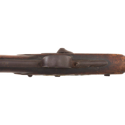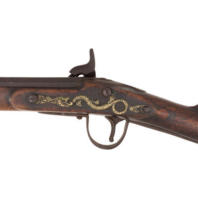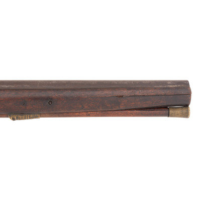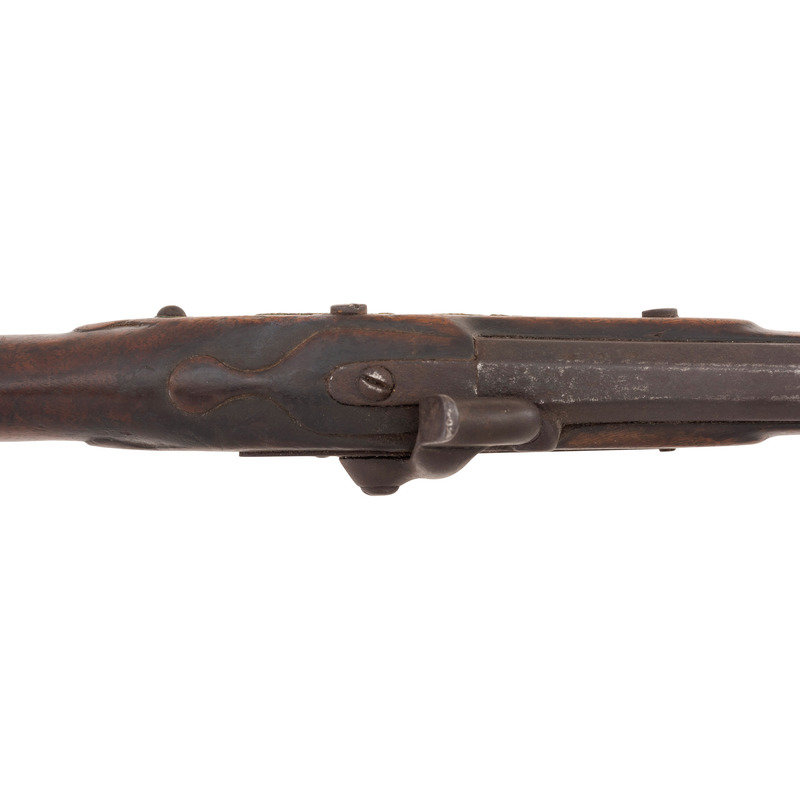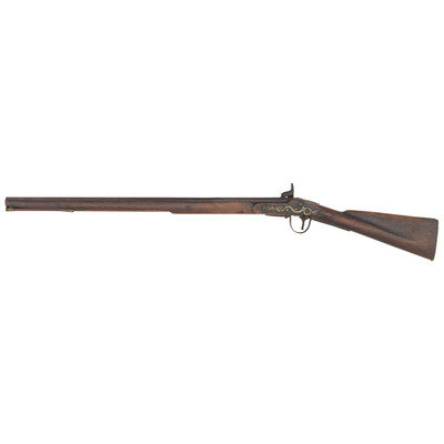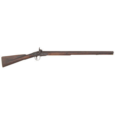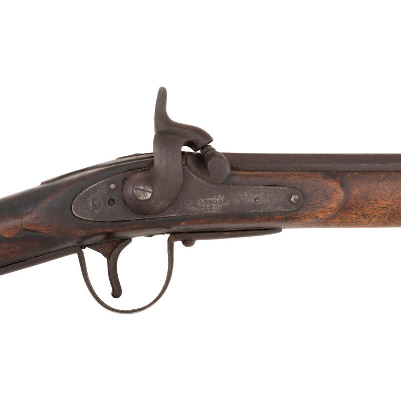 .58 caliber. 30.5" pinned three-stage octagon to round barrel. SN: NSN. Oxidized metal, brass and iron furniture, full-length walnut stock. Enfield style percussion lock marked "BARNETT/LONDON/1885" and with the seated "{FOX/EB}" of the Hudson's Bay Company at the tail. Breech with London commercial proof marks. Brass three-screw serpent side plate, oversized iron triggerguard, flat screwed brass buttplate. Stock with raised carved aprons around the tang and at the tail of the lock and counterpane. A single corrugated brass ramrod pipe secures an old brass tipped wood ramrod.