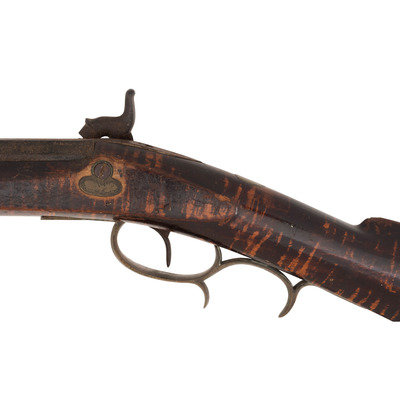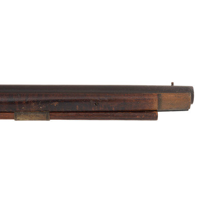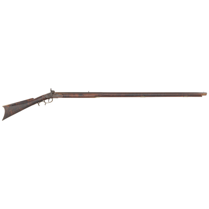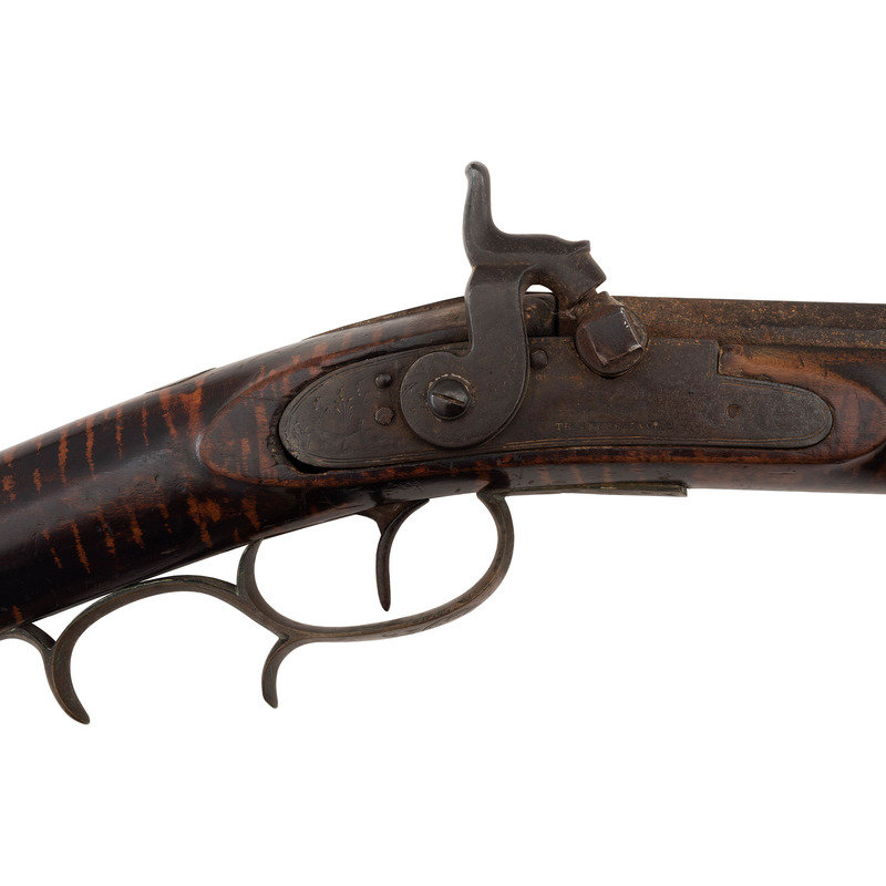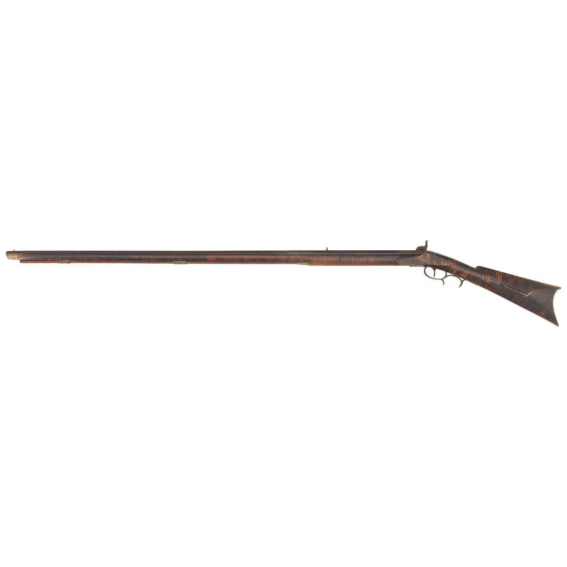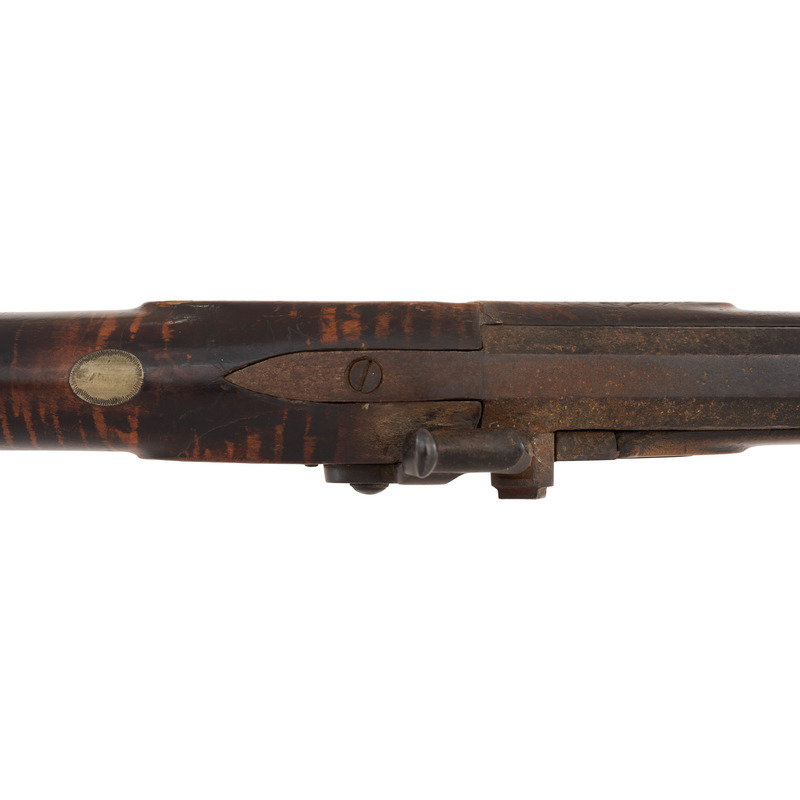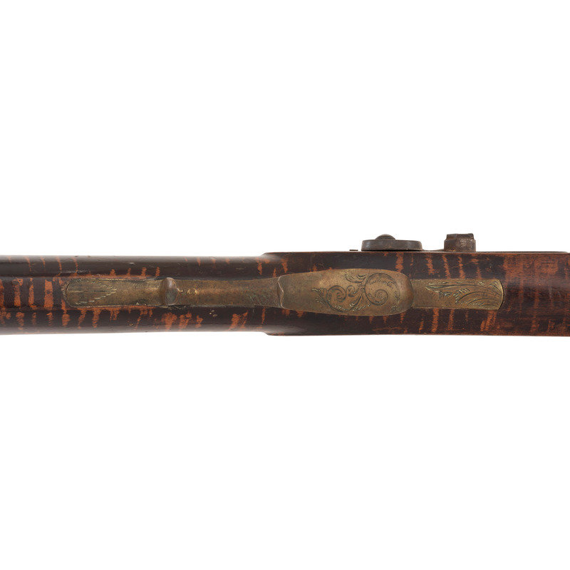 .54 caliber. 44" pinned two-stage octagon to round barrel. SN: NSN. Browned finish, brass furniture, faux striped hardwood full stock. Lightly engraved single-screw percussion lock marked "TRUITT BROS & Co". Top flat of barrel weakly marked "D P BROWN MAKER/LANCASTER PA". Barrel with drum bolster, typical of early percussion guns. Simple crescent brass buttplate, lightly engraved triggerguard with dual finger spur extensions, brass nose cap and ramrod pipes. Wood ramrod. Mr. Ness' notes on this rifle indicate that the gun was produced circa 1840 by David P Brown of Lancaster, a maker not listed in Sellers' American Gunsmiths. He further notes that Brown had a contract with the US Indian Department to provide guns for this government entity for trade to the Native Americans.