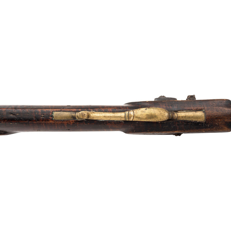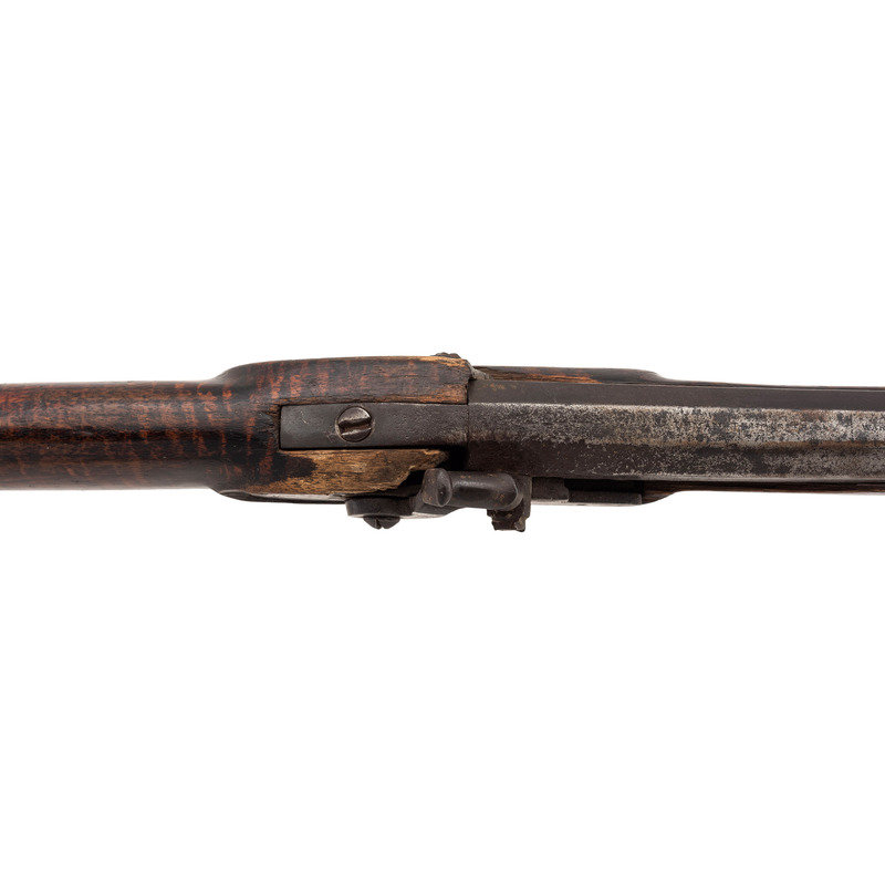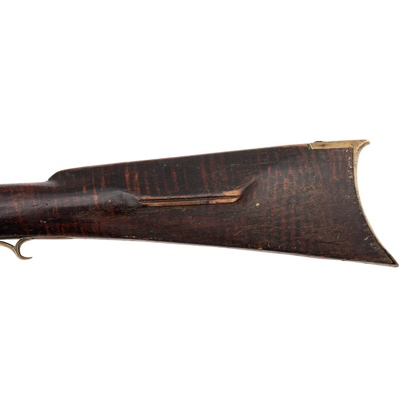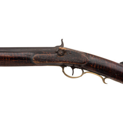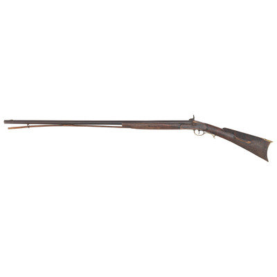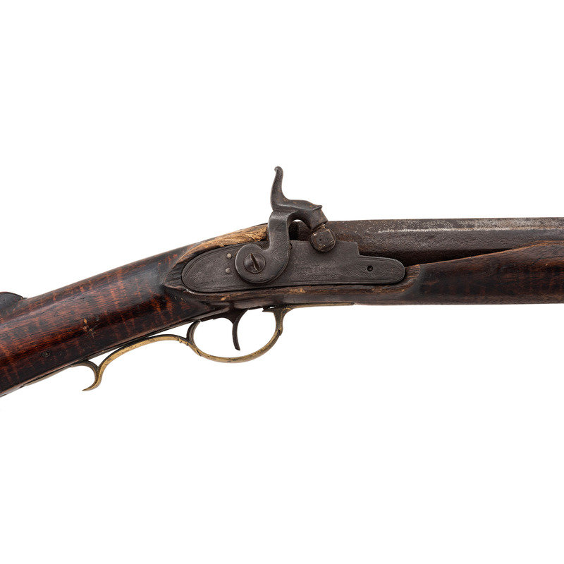 .56 caliber. 36" pinned octagon to round barrel. SN: NSN. Blued barrel, brass furniture, walnut stock with raised cheek rest. Single screw commercial percussion lock is lightly engraved and marked "HENRY PARKER/WARRANTED". Top flat of barrel with drum bolster is weakly marked "LEMAN LANCASTER PA WARRANTED". Simple brass crescent butt plate, plain toe plate, finger extension triggerguard. German silver front sight blade. Stock cut back to "half stock" configuration long ago, with an old iron wire ring in the upper barrel tenon to help retain a wood ramrod. As well worn and heavily used trade gun from the famous Leman shop in Lancaster.