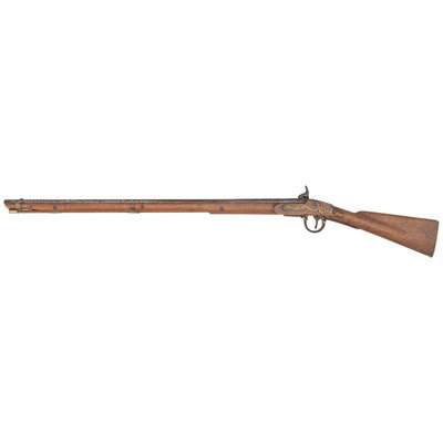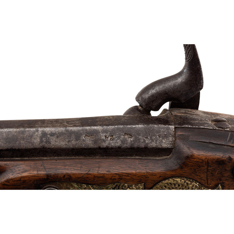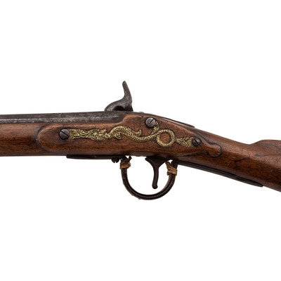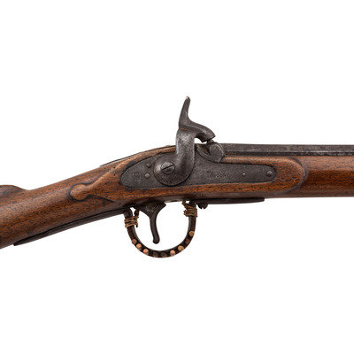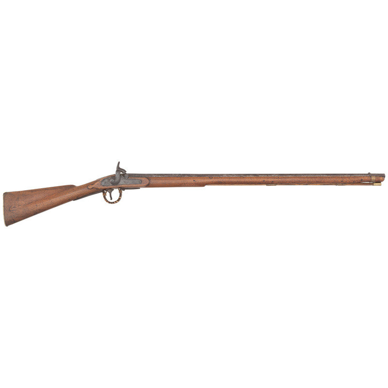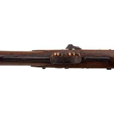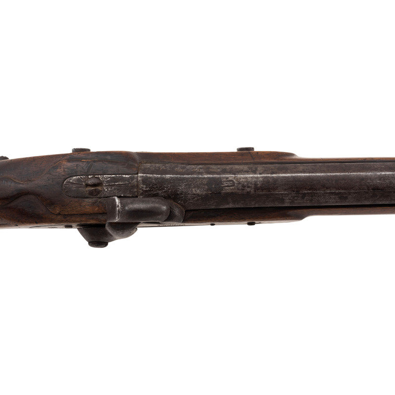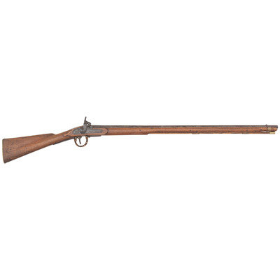 .60 caliber. 36" pinned three-stage octagon to round barrel. SN: NSN. Moderately oxidized metal, brass and iron furniture, full-length walnut stock. Enfield style percussion lock marked in three lines forward of the hammer "BARNETT/LONDON/1889" and with the Hudson's Bay Company "{Tombstone-Fox/EB}" trademark at the tail, with a weaker "HBC" mark on the top flat of the barrel. Breech with "JEB" stamp for John Edward Barnett, a small flag stamp and the usual London commercial proofs and a "24" gauge mark for .58 caliber. Typical Northwest gun features include the three screw brass serpent side plate, raised carved molding around the tang and at the tail of the lock and counterpane, the oversized iron triggerguard and the the flat brass buttplate. Forend with simple sheet brass reinforcement near tip, two corrugated brass pipes secure a brass tipped wood ramrod. Triggergaurd decorated with leather strap cut to hold percussion caps for ready access, wth the leather attached with twine. Some caps are still in place. A nice example of the old pattern muzzleloading guns still being traded to Native hunters and trappers as the dawn of the 20th century approached.
