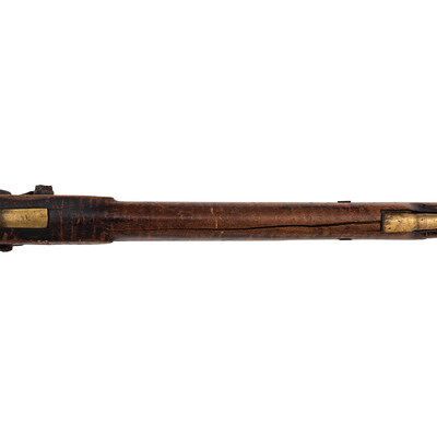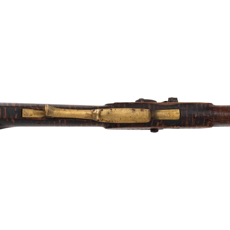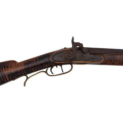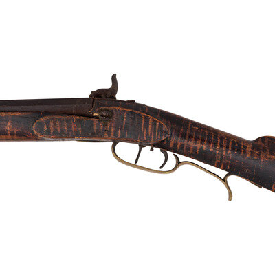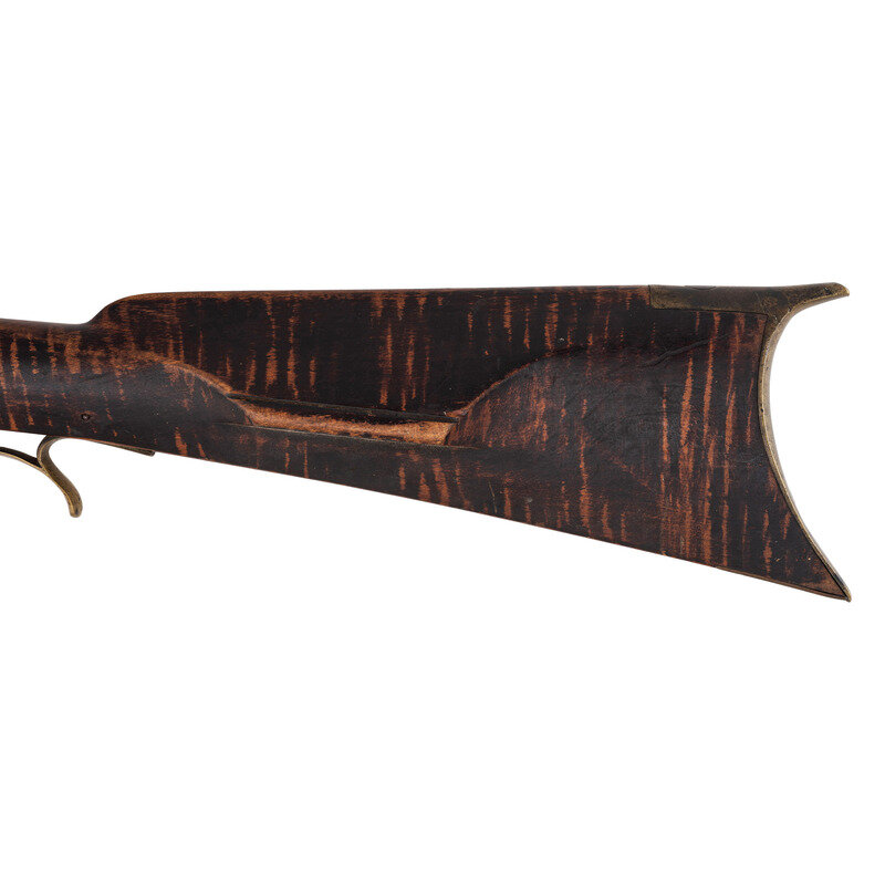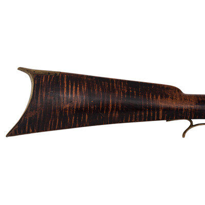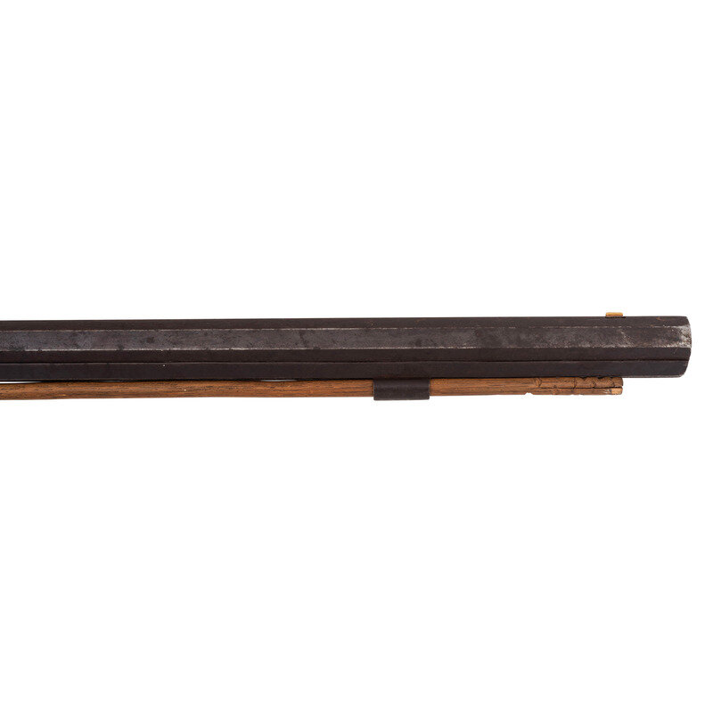 .36 caliber. 37.5" pinned octagonal barrel. SN: NSN. Browned finish, brass furniture, faux striped half-stock with raised cheek rest. Lightly engraved single-screw percussion lock with drum bolster is marked "LEMAN/LANCASTER, PA". Top flat of barrel marked "HE LEMAN/LANCASTER PA" and "WARRANTED". Double set triggers, period of use replaced notch rear sight, dovetailed brass front sight blade. Simple brass furniture includes a crescent buttplate, plain toe plate, finger extension triggerguard. Plain iron pipes attached to the under lug of the barrel retain a wood ramrod.