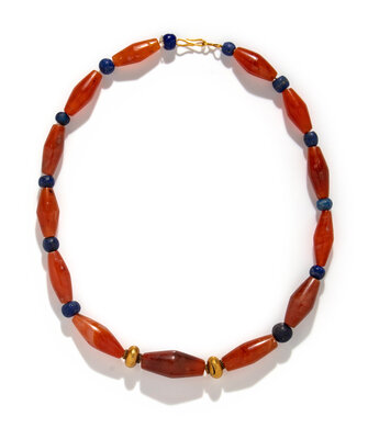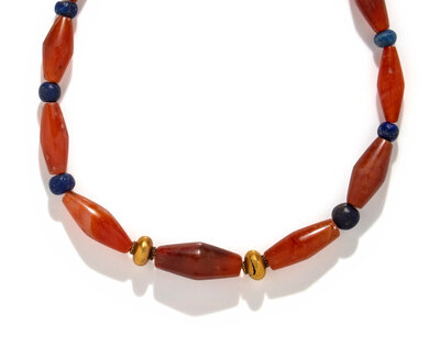 A Western Asiatic Carnelian, Lapis Lazuli, and Gold Bead Necklace