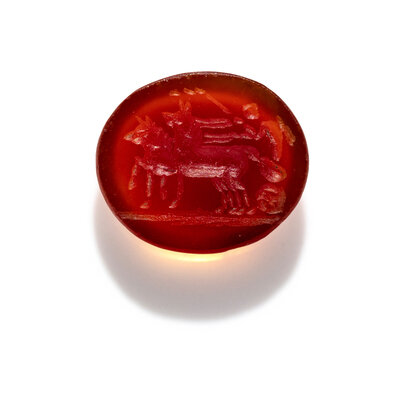 A Roman Carnelian Intaglio with Eros Driving a Biga