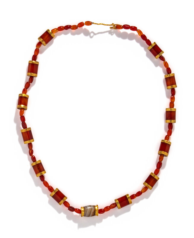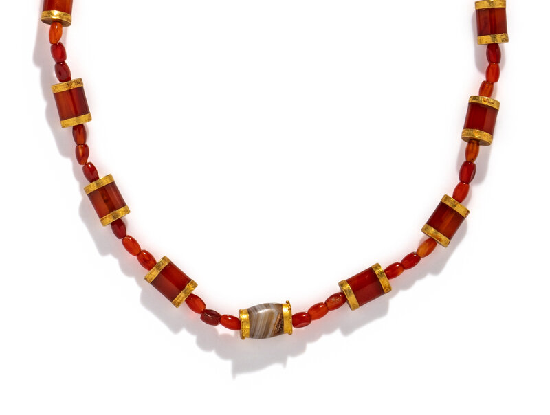 A Near Eastern Carnelian, Banded Agate, and Gold Bead Necklace