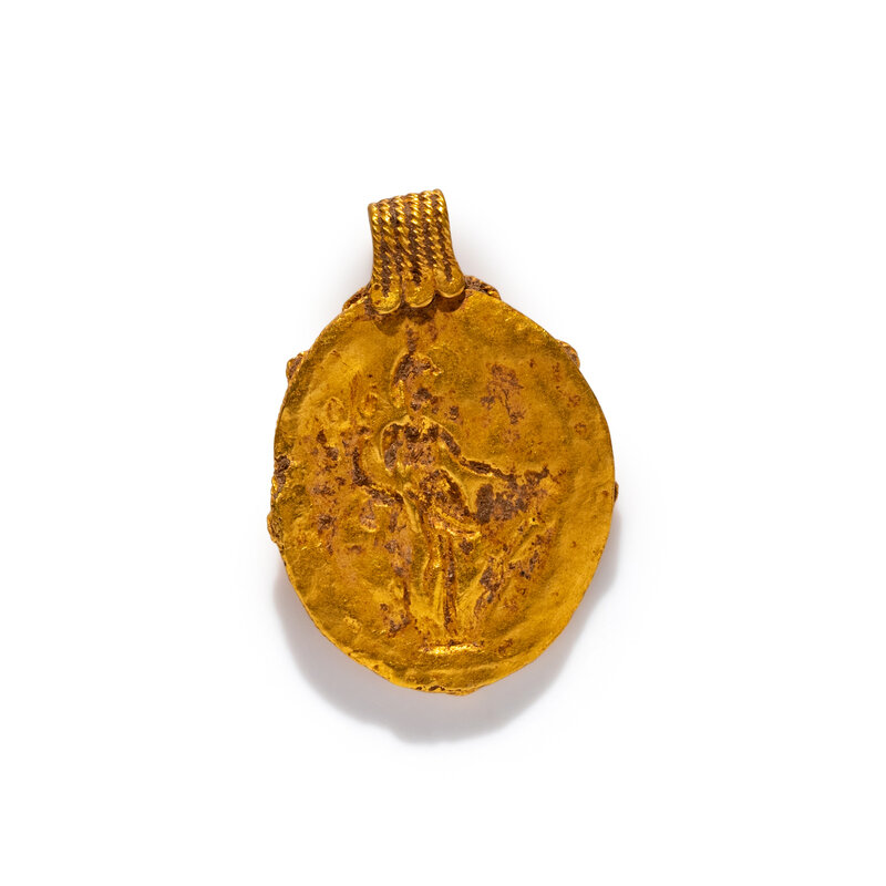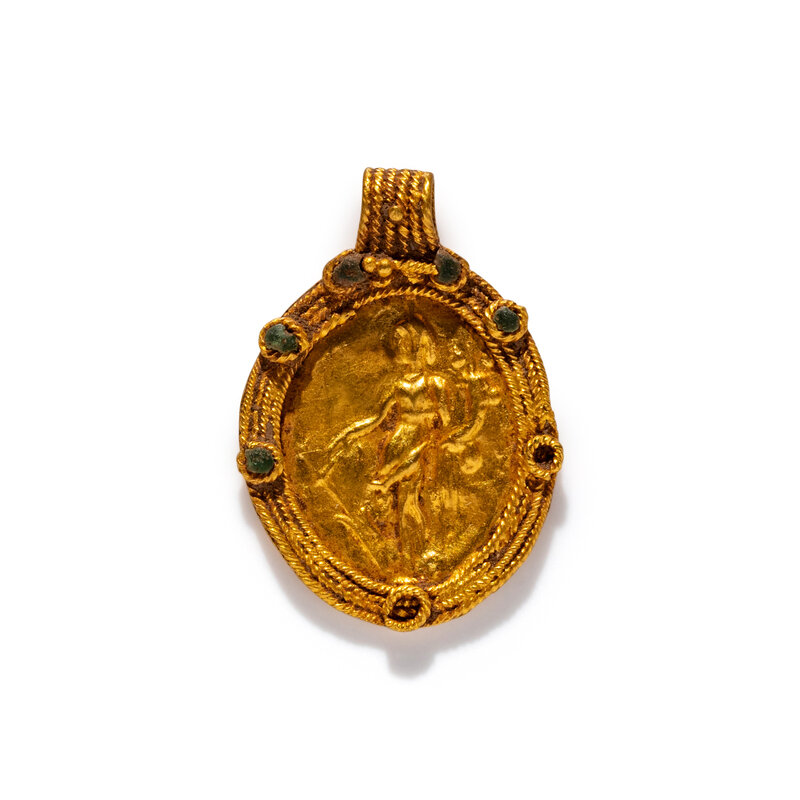 A Roman Gold and Green Glass Pendant with the Goddess Fortuna