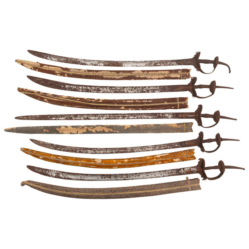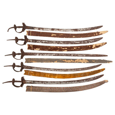 All items have about 35.5" blade and are 45.5" overall. Single edged curved swords with braces around ricassos. All items feature khanda hilts with pommel spike and clamshell guard. All items are with wood scabbards that are wrapped with textiles.