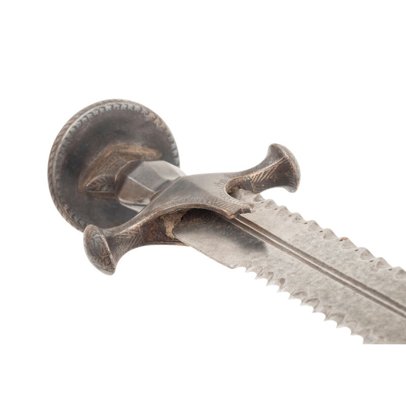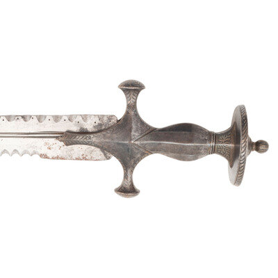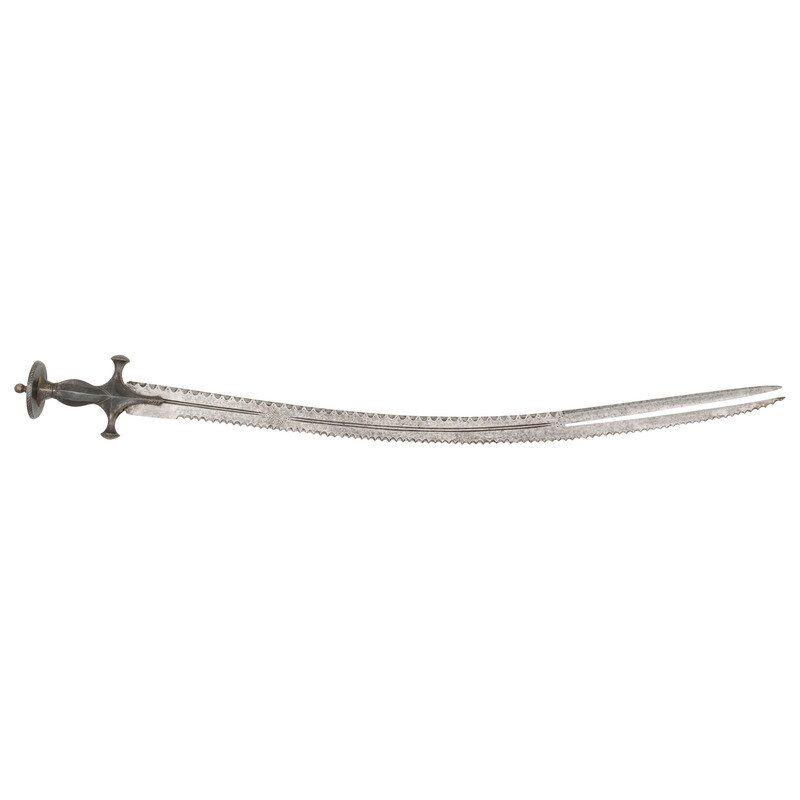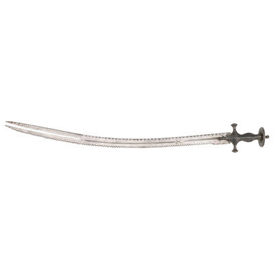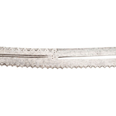 29.5" blade. 34.25" overall. Single edge serrated blade with a bifurcated tip, 10" false edge, and dull serrated backside. Blade also has dual quill fullers and punch dot designs to both sides. Talwar-style hilt appears to be made from steel and features floral etchings and some possible silver koftgari work that has worn away.