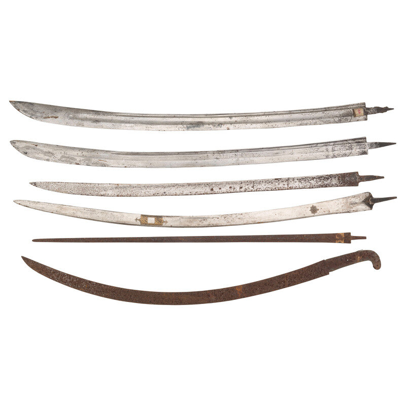 Lot of six blades ranging in length from 30.5" to 35.25" overall. Four of the six feature curved blades with short tangs intended to be set into hilts with hidden tang construction, while a fifth features a full width tang in the shape of a traditional Shamshir hilt. Also included is a straight double-edged blade with a compact tang. One blade features gold Damascened geometric designs while two blades feature light scrollwork. Latter two blades feature Sun and Moon designs with one displaying a snake coiling along its length.