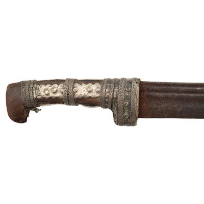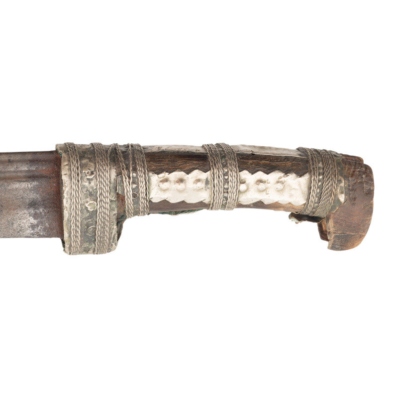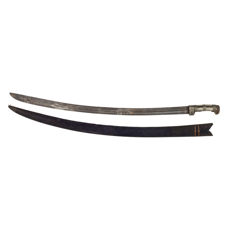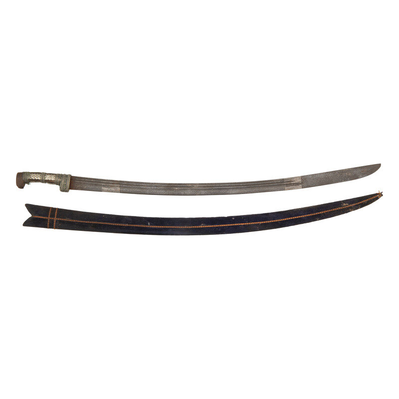 29" blade length. 37.8" overall with scabbard and hilt. Single edge curved sword with a triple fullered blade and guard-less wood hilt wrapped in nonferrous metal sheet and wire. Hilt is embellished with embossed dot patterns to all metal strips with wire wrap forming multiple stripes along its length. Comes in a purple felt wrapped wood scabbard.