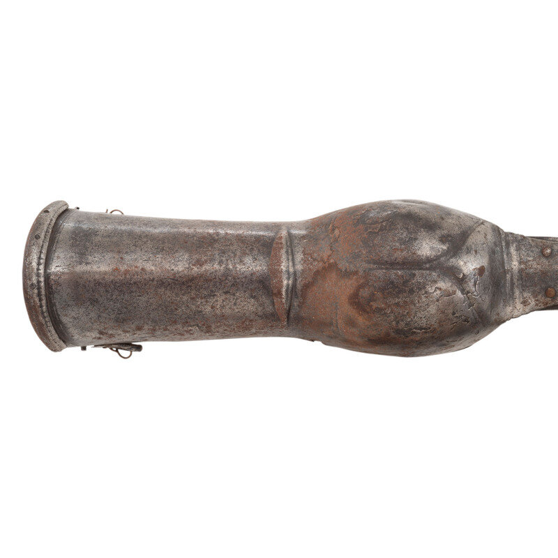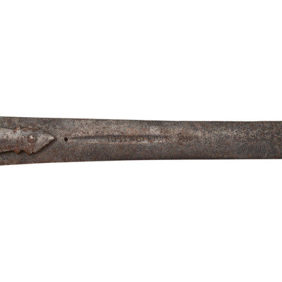 1.) 39" blade length. 50" overall. Double edge rounded spear tip blade with 3" narrow fullers to both sides. Sword blade possibly of European make as both fullers are chiseled with markings that appear to be French or Latin and are followed by an anchor marking surrounded by four stars. Gauntlet is made of iron and blade is fastened with three rivets.