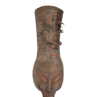 2.) 28.25" blade length. 39.25" overall. Double edge spear tip blade with 11.5" steel braces to both sides. Hilt is made of brass, chiseled with Arabesque borderwork, has brass tassels, and is embossed to resemble a grotesque head. Appears to have been painted red at some point.