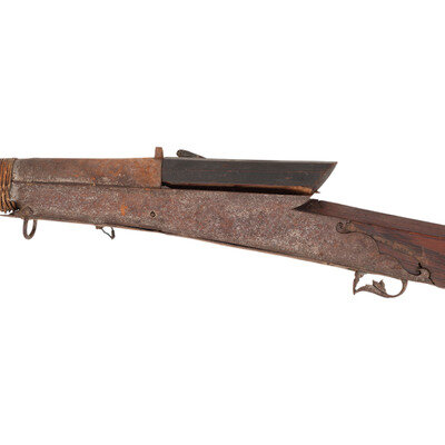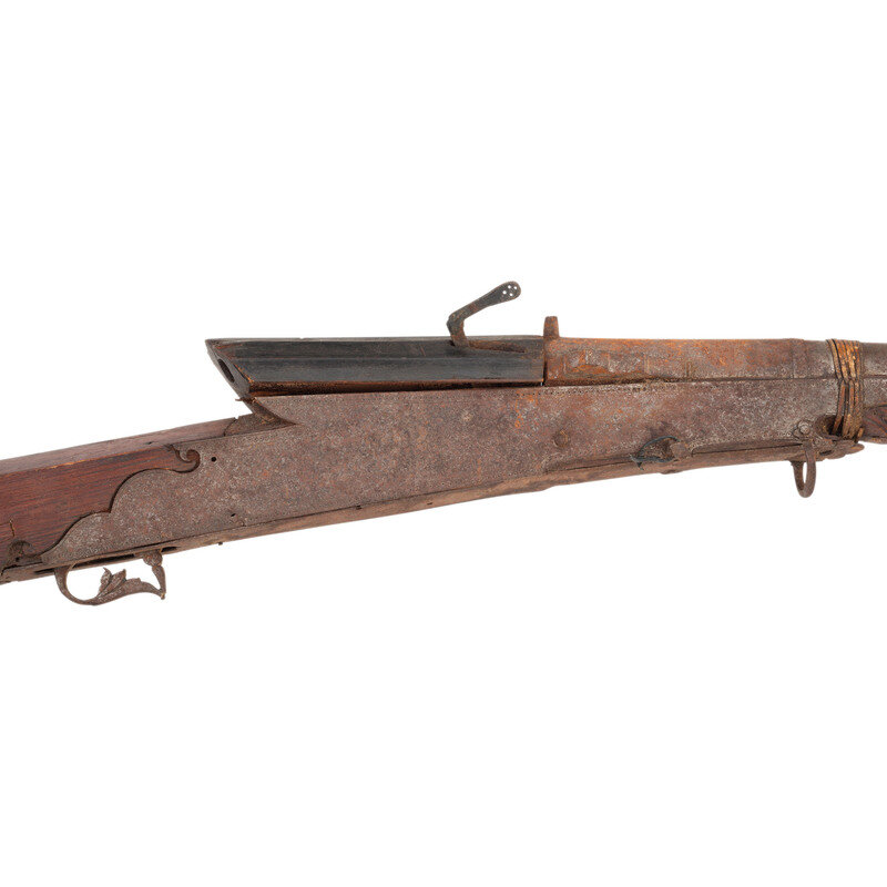 2.) Toradar - About .46 caliber. 31.5" barrel length. SN: NSN. Bright or browned steel finish that is mostly bare and covered by oxidation. Hardwood stock with a straight hexagonal butt that has a carved horn buttplate, and forearm that is simple carvings forward of frame. Matchlock musket with fixed notch rear sight and bead front sight. Item features flared muzzle with gold accented engravings, wire barrel bands, and double sling loops. Barrel is engraved with what appears to be Indo-Persian text, and frame fittings have simple punch dot borderwork.