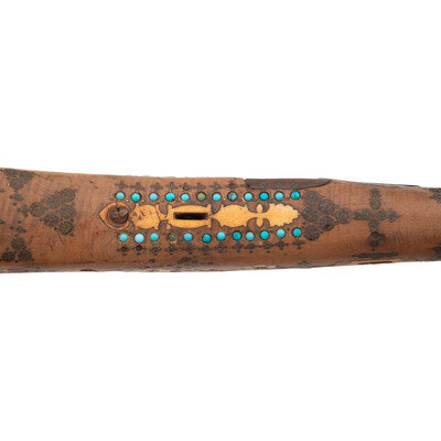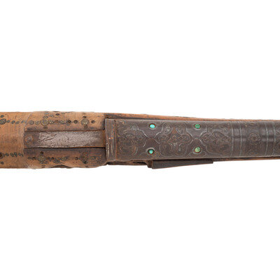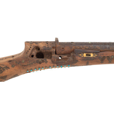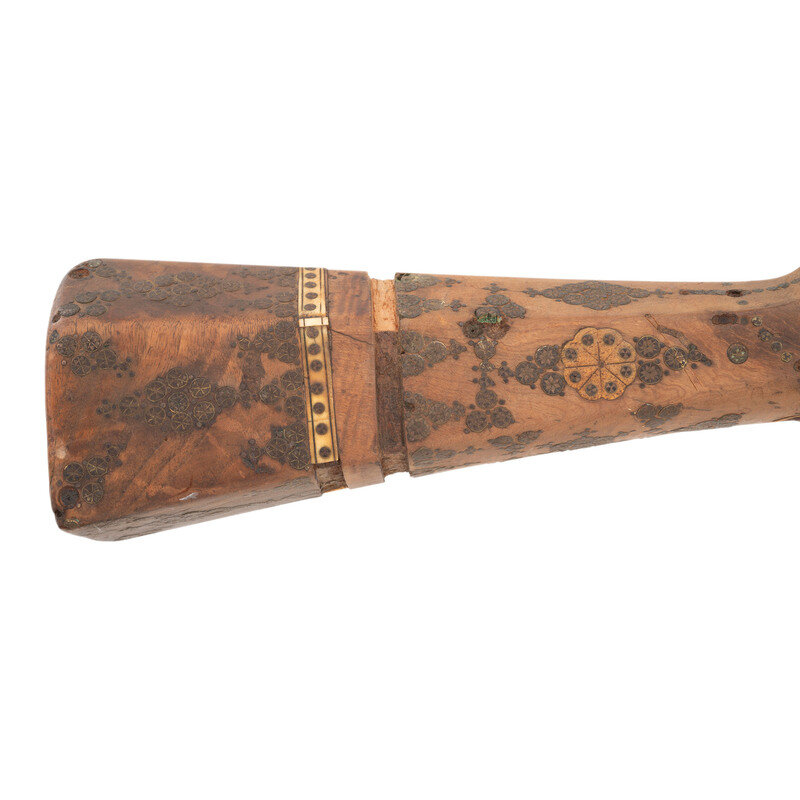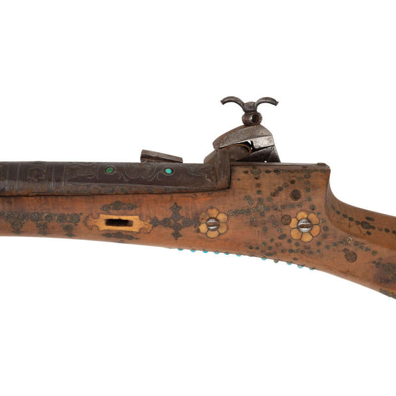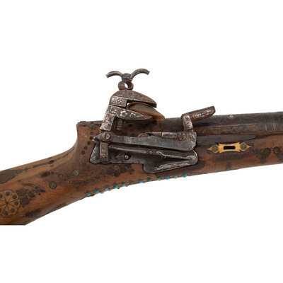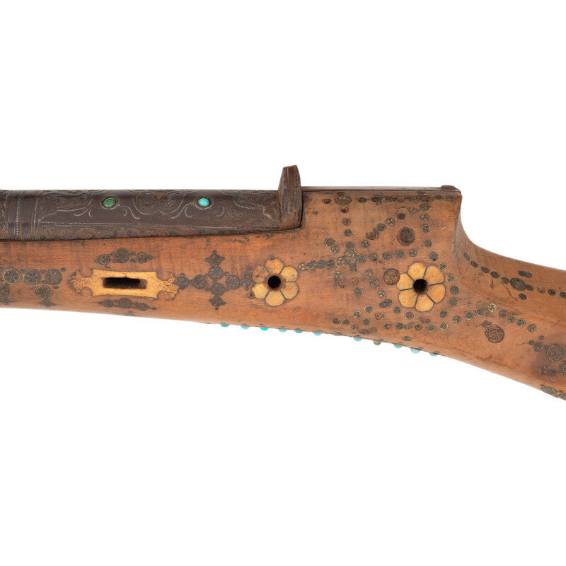 1.) Shishana - About .70 caliber flared muzzle. 36" barrel length. SN: NSN. Browned metal finish. Hardwood stock (most likely Turkish walnut) has a hexagonal butt and full length forend, with elaborate wire, ivory, turquoise, and coral inlay overall to both stock and barrel. Barrel is also chiseled with Arabesque motifs and has a gold band toward muzzle. Miquelet action musket with a primitive peep sight and dovetail cutout to muzzle. Lock is chiseled with floral motifs and has very strong spring. Item is missing components including trigger, barrel bands, stock pins, and many inlays.