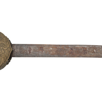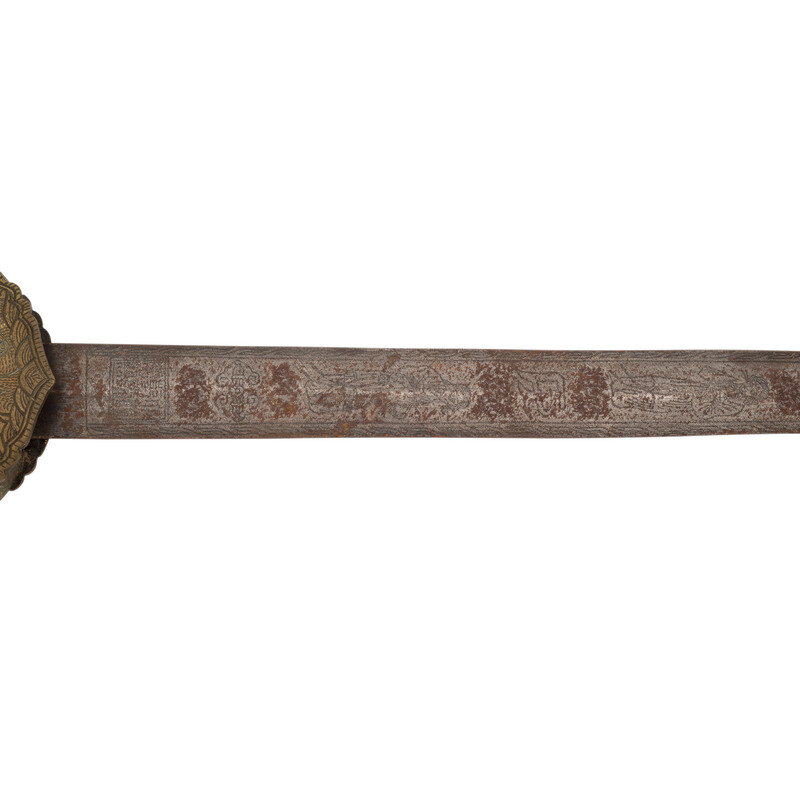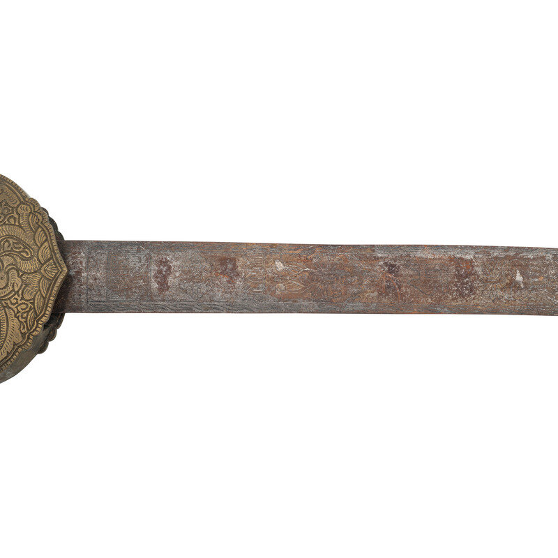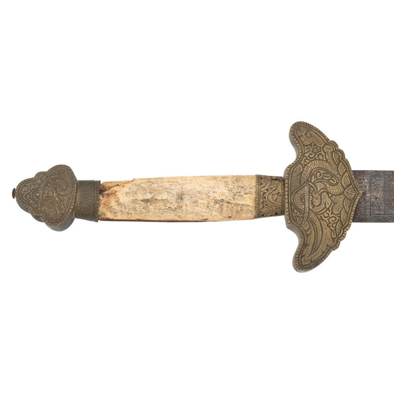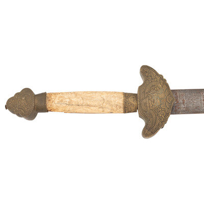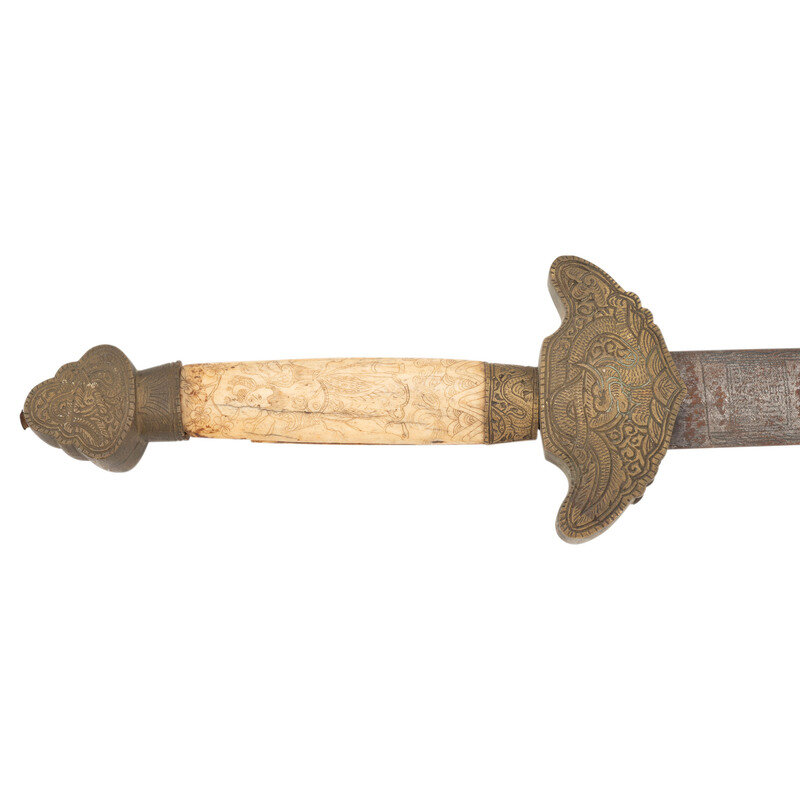 2.) Jian-style Sword - 32" blade. 41" overall. Double edged spear tip blade etched to both sides with what appears to be engravings depicting figures, dragons, and text that is possibly Korean. Fittings are made of brass and are also engraved with similar motifs. Grip is made of bone panels and is engraved with details that appear to be religious figures.