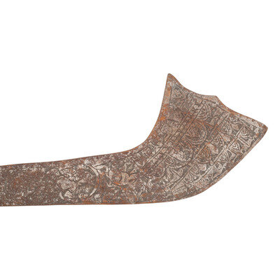 1.) Nepalese Kora - 20" blade, 25" overall. Single edge forward curving blade with a widened tip. Blade appears to be chiseled with religious and regional motifs. Hilt appears to be of talwar style and possibly had gold koftgari at some point.