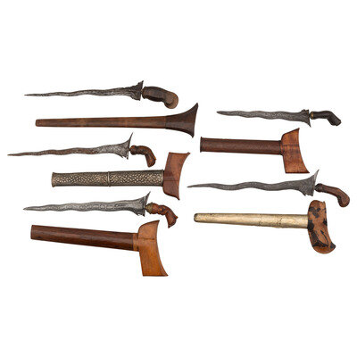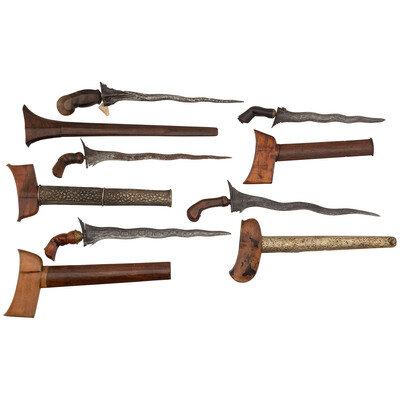 Lot of 5 Indonesian kris knives with blades ranging from 10" to 13" in length. All blades are wavy and have a watered texture. All blades are with wood scabbards and handles. Two of the scabbards are fitted brass and silver wrapping that is pressed with designs.