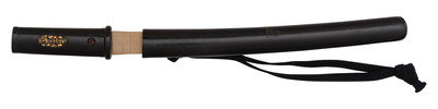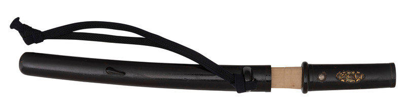 17.25" overall with tsuka and saya. Japanese tanto koshirae without blade. Polished black ray skin wrapped saya and tsuka. Saya features two kurikatas and a black sageo. Tsuka has simple fuchi and kashira, with matching menukis that appear to be pots, jars, or another type of vessel. Item is with tsunagi.