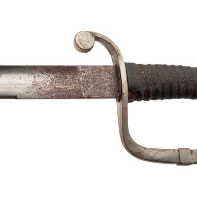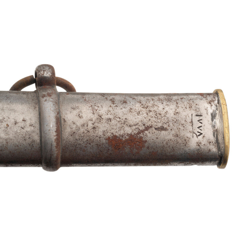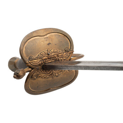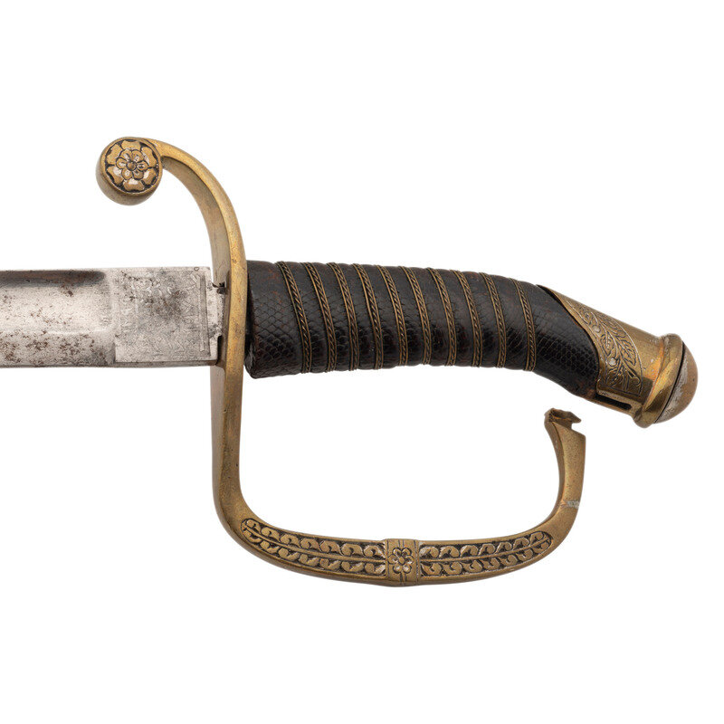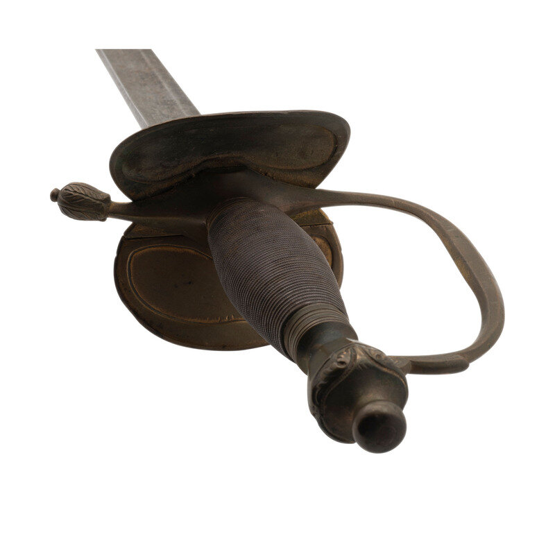 1.) Spadroon shows a 31" blade length and 39" overall length with scabbard and hilt. British sword comes with its leather scabbard and shows a weak maker marking forward of the left ricasso.