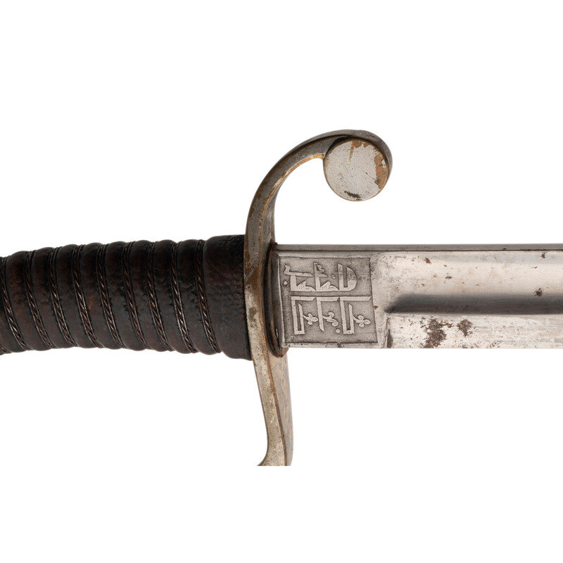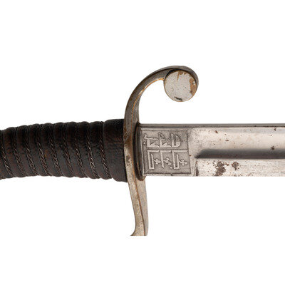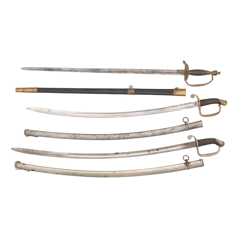 2-3.) The latter swords feature etched designs with Farsi writing to the blades and ricassos, along with Persian numerals to one metal scabbard's throat. Blades measure 33" to 35" in length with overall lengths ranging from 39.25" to 41". Shorter sword features a brass hilt with engraved floral designs, a leather and wire wrapped grip, and scabbard with brass throat. The longer Persian saber features similar etchings to the blade with a nickel plated hilt and scabbard.