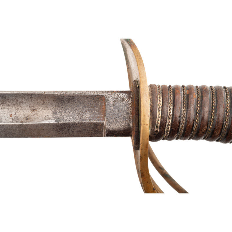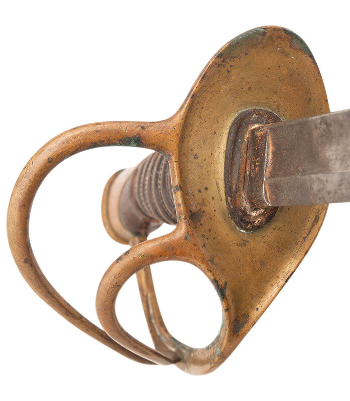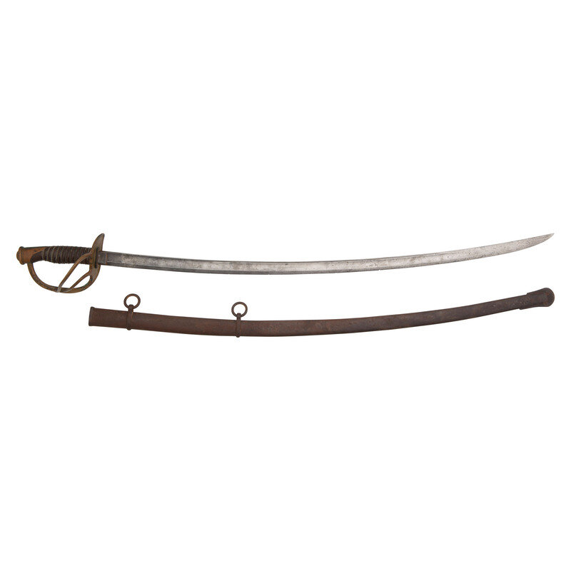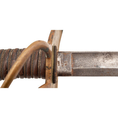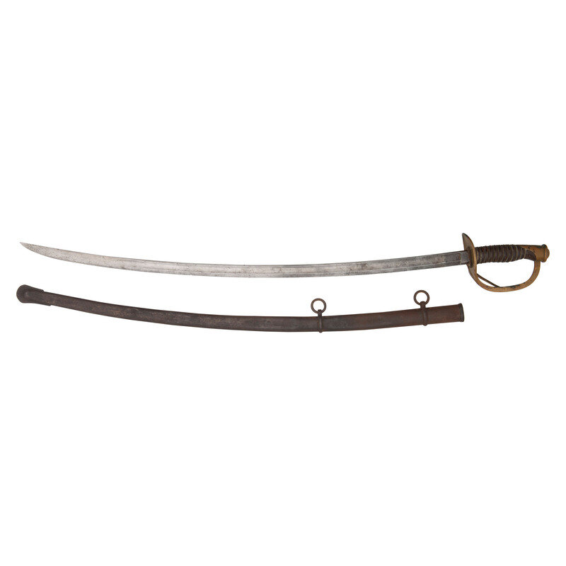 35" curved single-edged blade with a 26.5" stopped median fuller and an 18" secondary fuller near the spine. 41" in overall length with a 6" hilt mounted with a cast brass two-branch guard with knuckle bow and Phrygian helmet pommel cap. Grooved wood grip covered in leather with 12 wraps of twisted wire. Reverse ricasso of blade marked in an oval cartouche J.D. MILLARD/CLAYVILLE, NY. Obverse ricasso marked U.S./C.E.W./1862. The initials are those of US arsenal contract arms sub-inspector Charles E. Wilson who inspected Millard contract sabers in 1862. His inspection marks are also found struck twice on the pommel cap. The saber is accompanied by a steel scabbard with no visible inspection marks.
