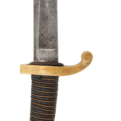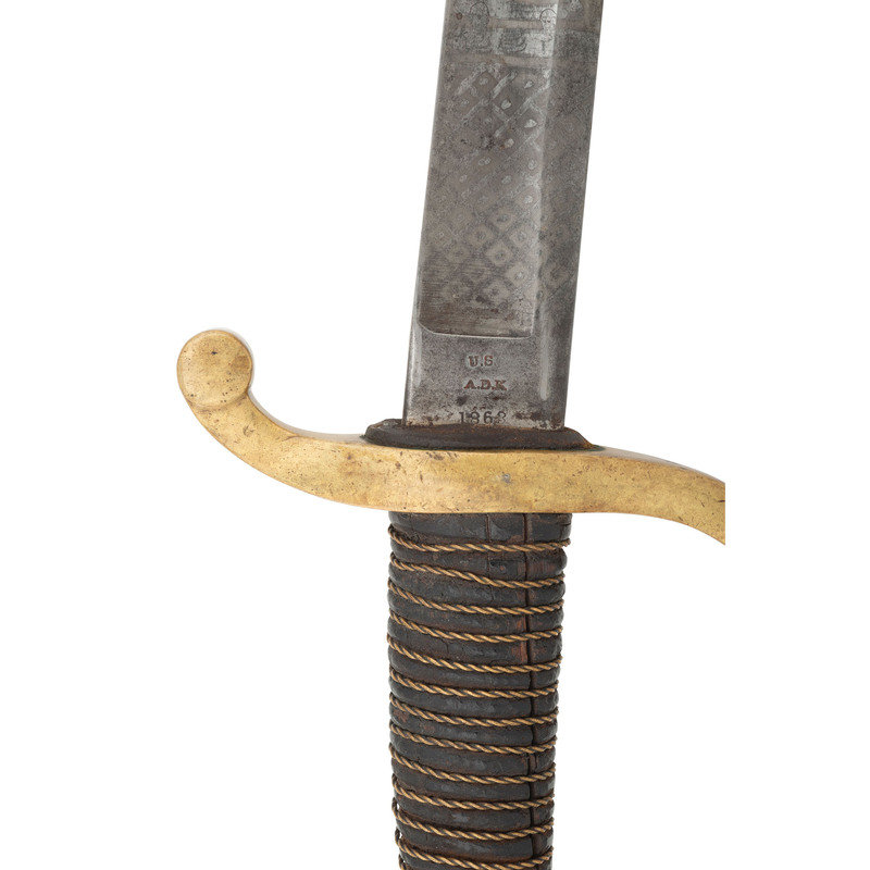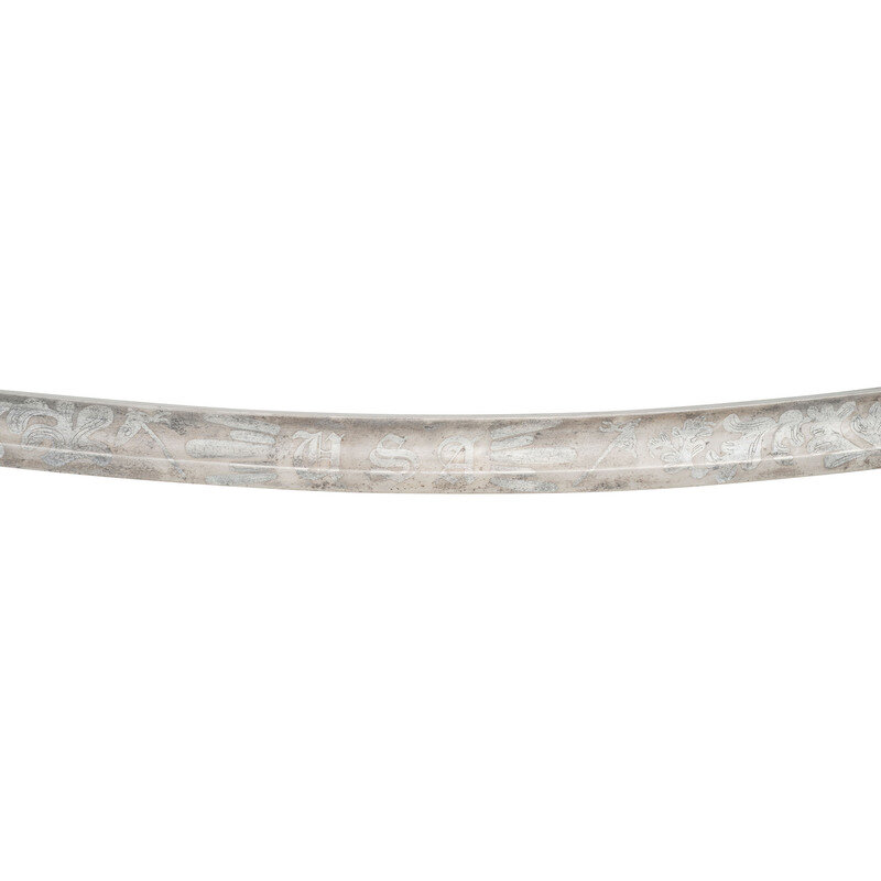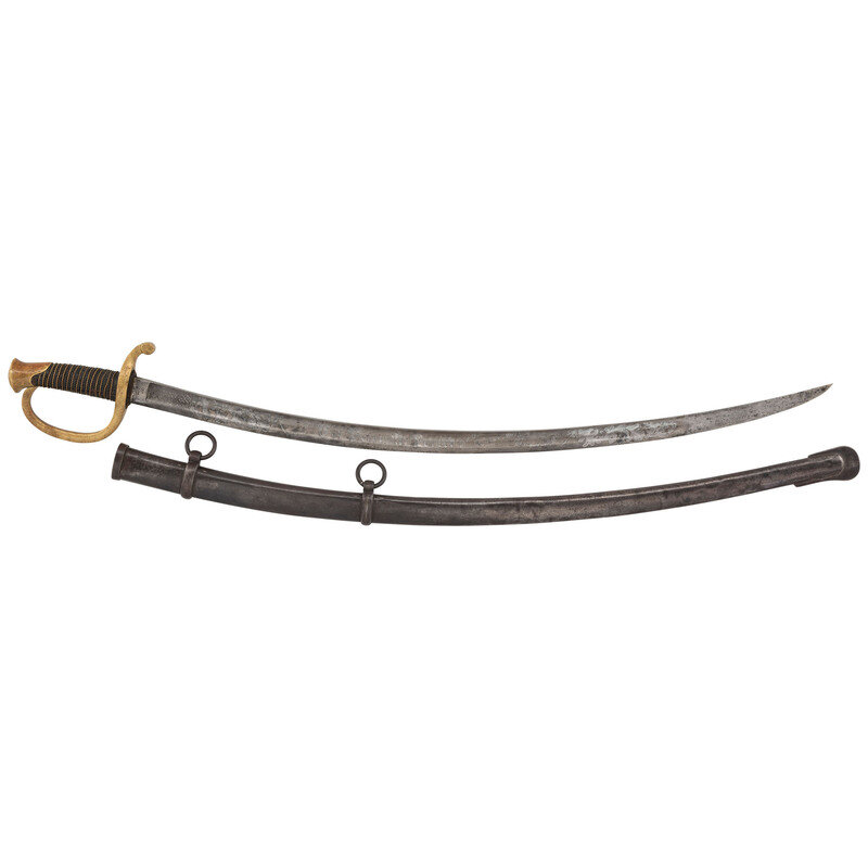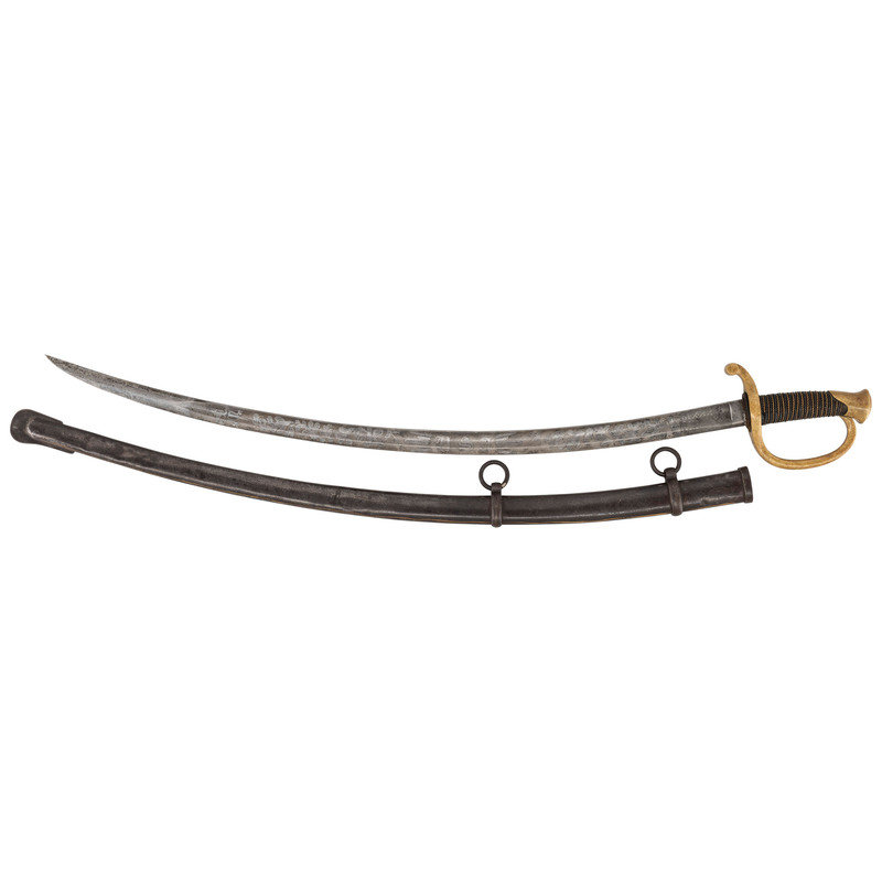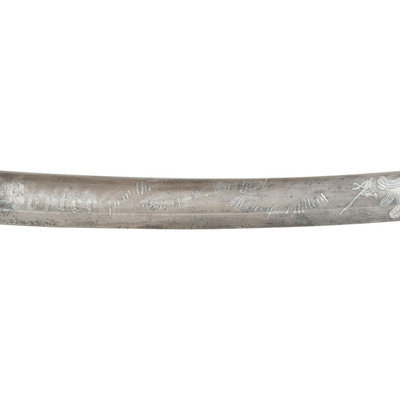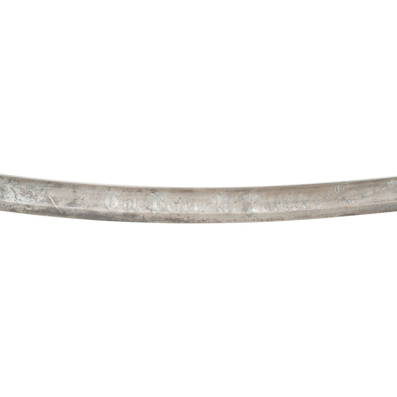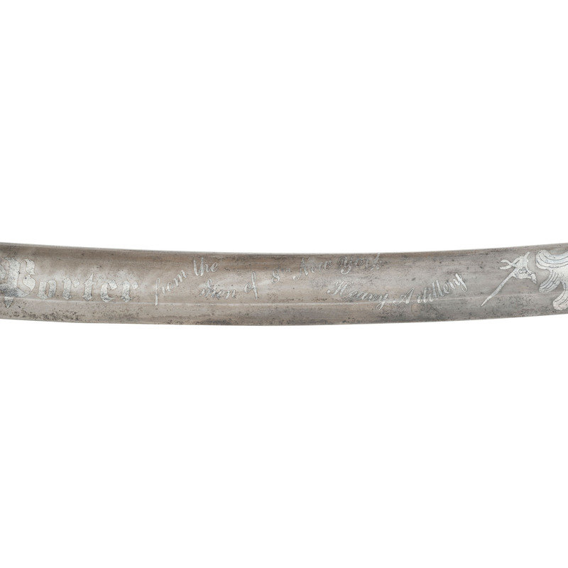 32" curved, single edged blade with 24.75" stopped median fuller, blade 1.25" wide at ricasso. Overall length 37.75" with a 5.5" brass hilt with single branch rounded knuckle bow and forward swept upper quillon terminating in a flat disc. Grooved wooded grip with leather covering and sixteen wraps of twisted brass wire. Standard enlisted 1840 cavalry saber marked U.S. / A.D.K. / 1863 on the obverse ricasso and in three lines on the reverse AMES MFG CO / CHICOPEE / MASS, with lines under the "G" and "O" in the first line. Pommel cap with weak ADK inspection and the obverse drag is inspected by Andrew D King as well. The blade has been decorated with modern acid etching featuring geometric patterns and foliate and martial themes with a large USA in the center of the reverse and Presented to Col. Peter A Porter from the men of the 8th New York Heavy Artillery on the obverse. The saber is accompanied by its standard sheet iron scabbard with two suspension rings. While the saber is completely authentic, the etching on the blade is not.