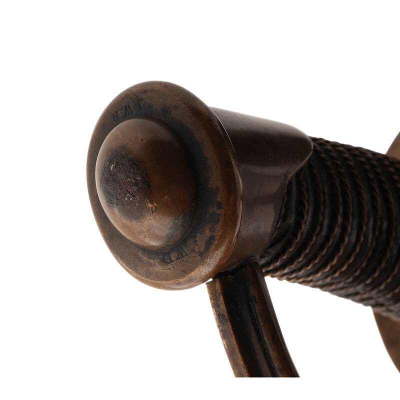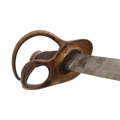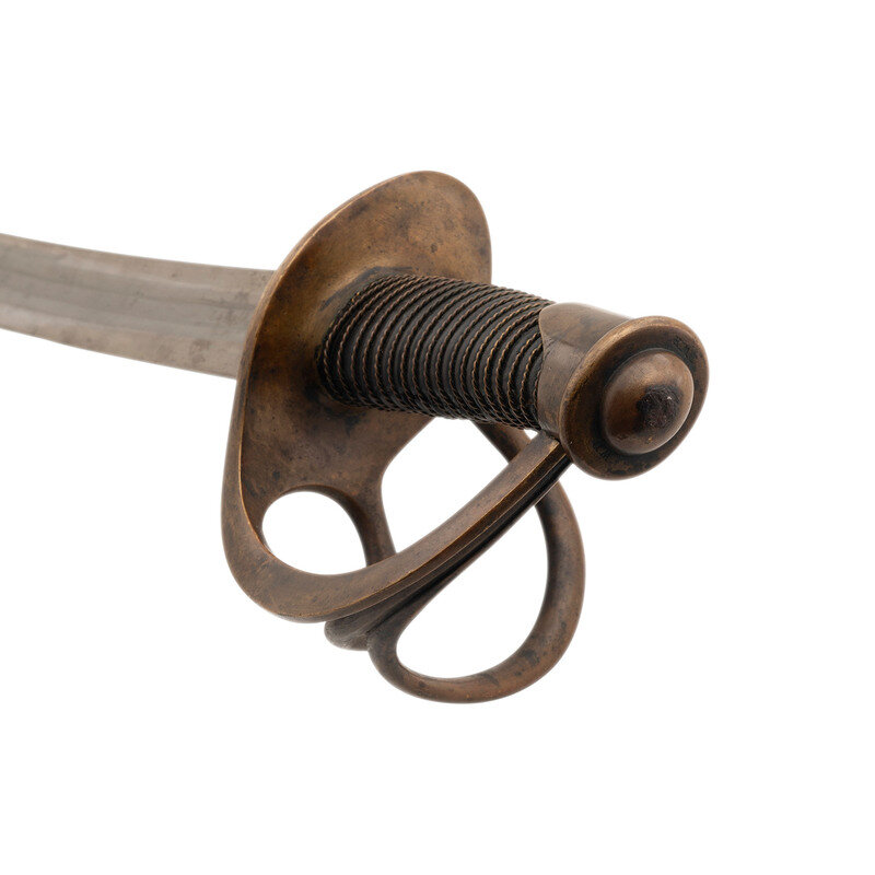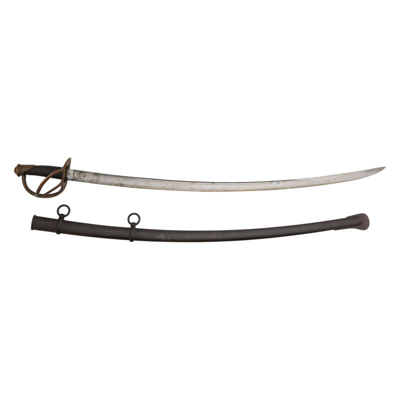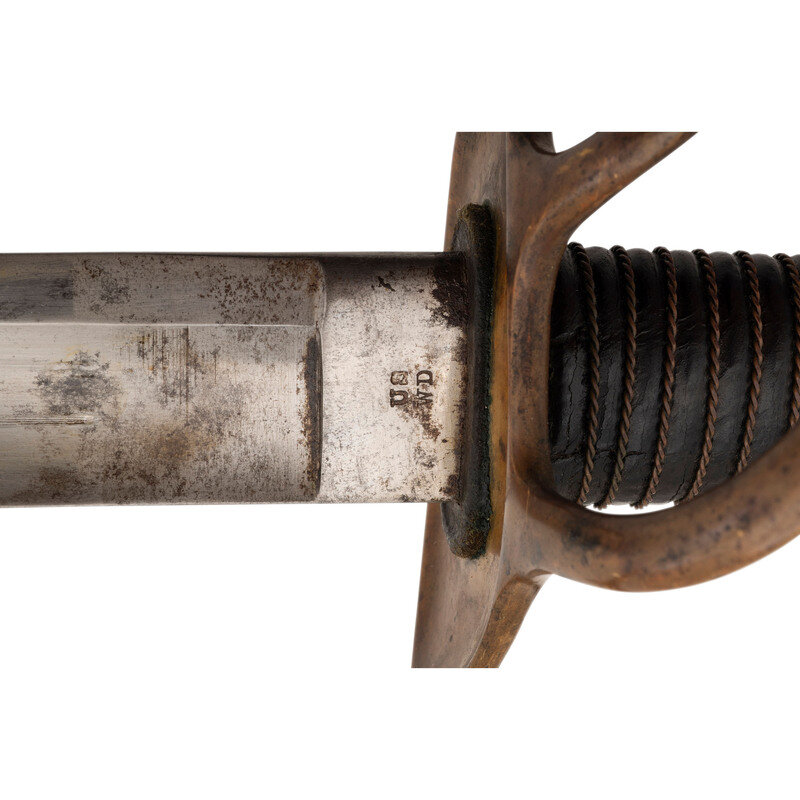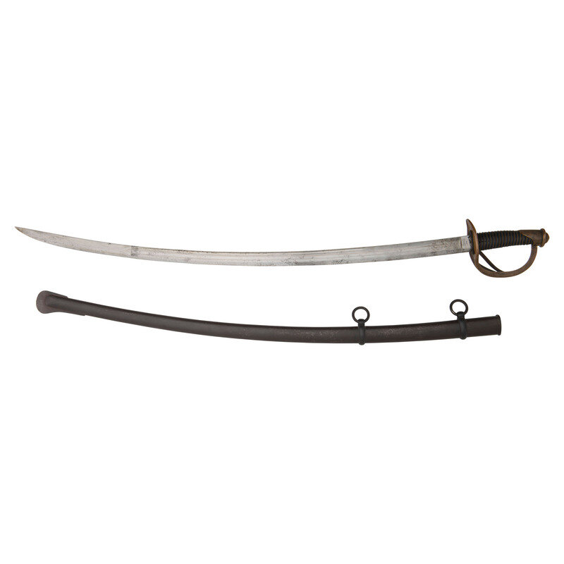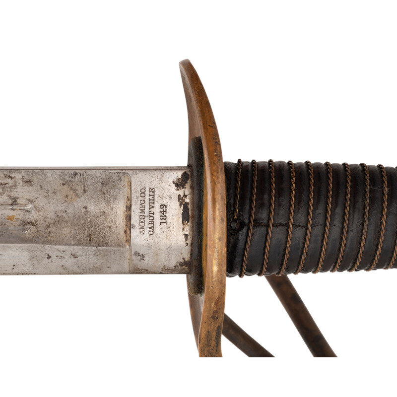 35.5" curved, single-edged blade with a 26" stopped median fuller and an 18" secondary fuller at the spine. Blade 1.25" wide at the ricasso. 41.25" in overall length with a 5.5" hilt. Two branch brass guard with knuckle bow and Phrygian helmet pommel cap. Grooved wood grip covered in leather with 19 wraps of twisted wire. Obverse ricasso marked US/WD with the "WD" being the mark of arsenal sub-inspector William Dickinson. Reverse ricasso marked AMES MFG. CO/CABOTVILLE/1849. Pommel cap with WD and JWR (James W Ripley) inspection marks. No inspection marks visible on scabbard drag or throat. Includes a steel scabbard with two suspension rings.