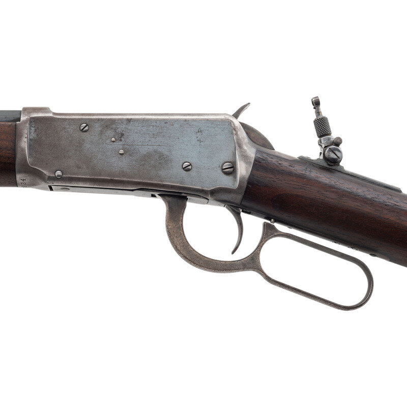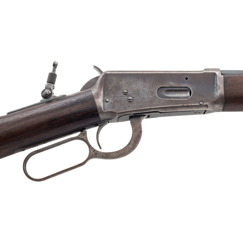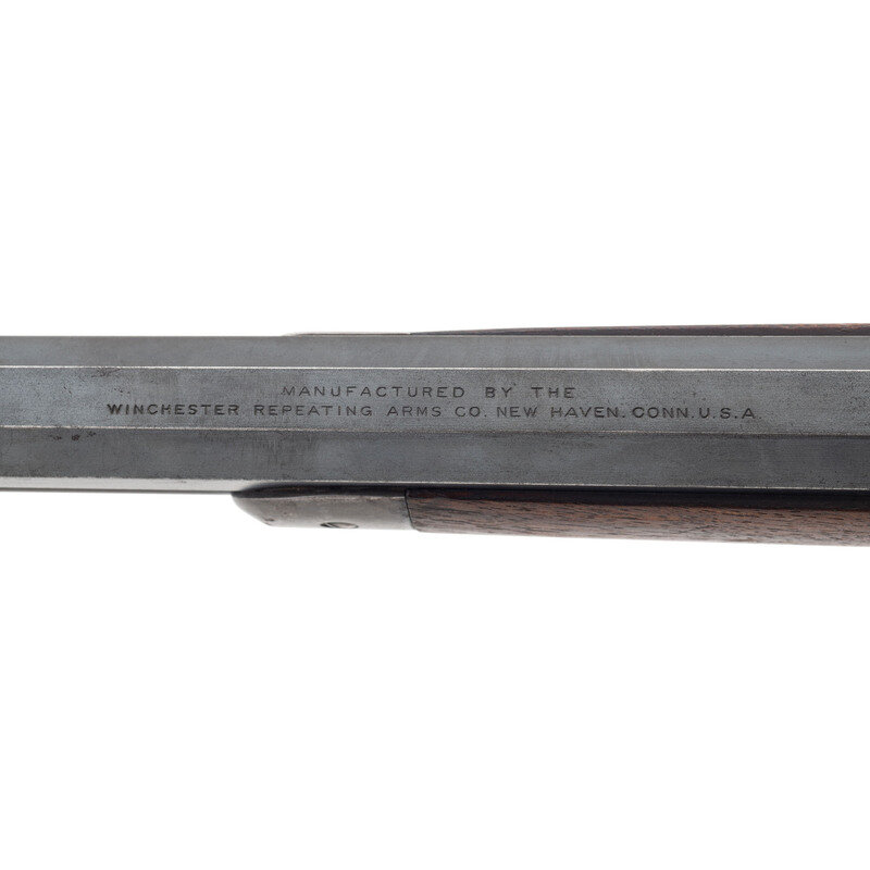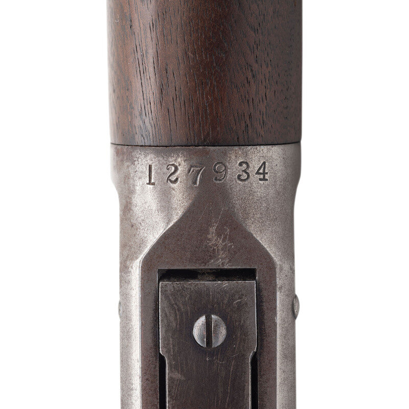 .30 WCF. 26" octagonal barrel. SN: 127934. Blued metal finish. Two piece walnut stock has a plain straight grip and forearm. Lever action rifle with a DA-marked folding tang peep sight, Marbles/Winchester adjustable folding express notch rear sight, and a Marbles "tunnel" front sight with brass bead. Item features a full tube magazine and crescent steel buttplate. There is an X mark in front of triggerguard.