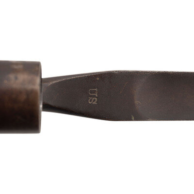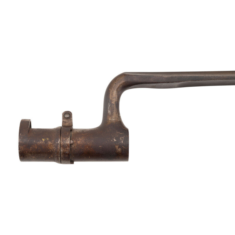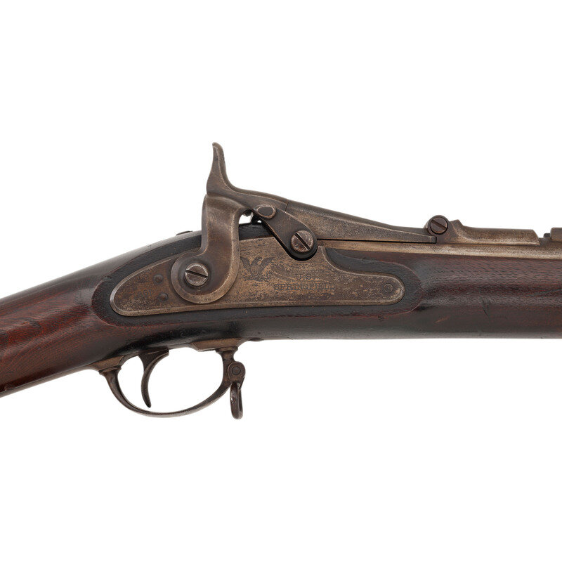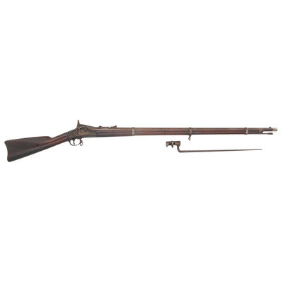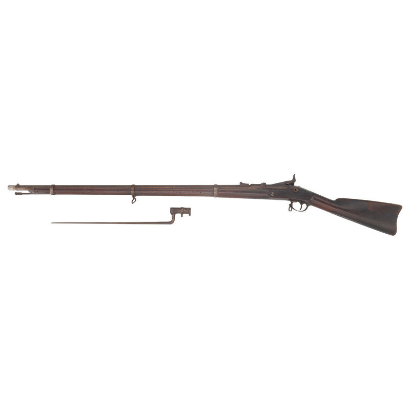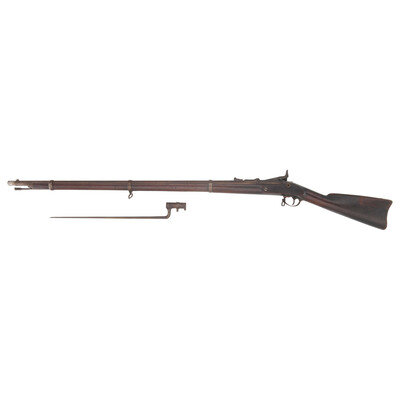 .50-70. 36.75" barrel. SN: NSN. Bright finish, iron furniture, walnut stock. Single shot breechloading metallic cartridge alteration of a Civil War muzzleloading musket via the Allin "Trapdoor" system. 1865 dated altered Springfield Model 1864 lock, breechblock marked 1866/{Eagle Head}, counterpane with crisp WPT (William P Tayor) and ESA (Erskine S. Allin) cartouches. Retains the correct Model 1866 leaf rear sight, combination musket front sight and socket bayonet lug and two sling swivels that may be later additions. A jag head cleaning rod and US Model 1855 socket bayonet are also included.