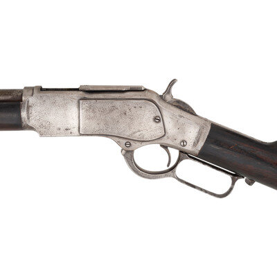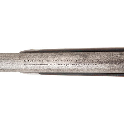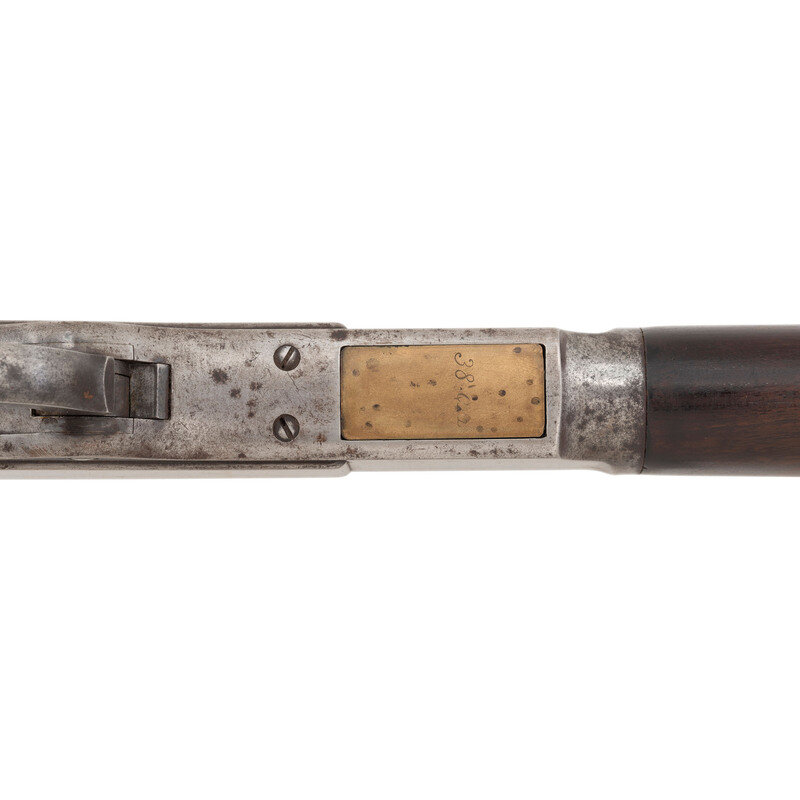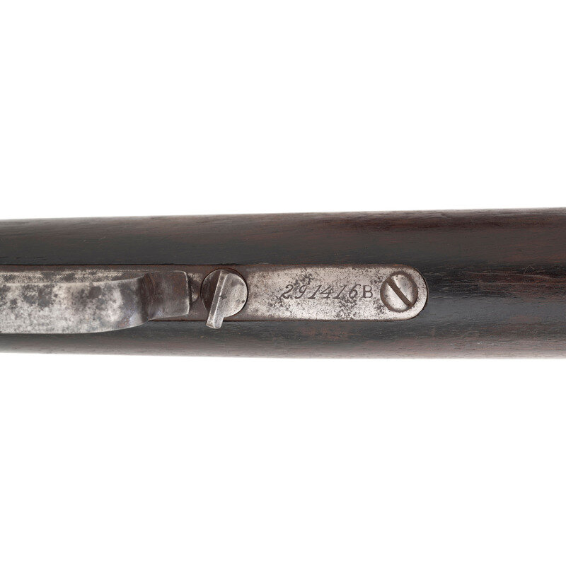 .38-40 WCF. 24" round barrel with full magazine. SN: 291416B. Finish is bare, most likely blued with case hardened parts. Two piece walnut stock has a plain straight grip and forearm. Lever action rifle with adjustable semi buckhorn rear sight and blade front sight. Item features a full tube magazine, dust cover, and trapdoor buttplate void of contents.