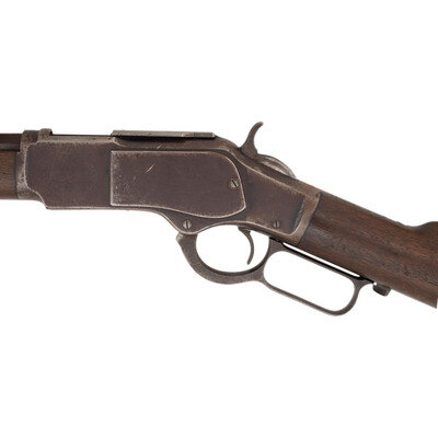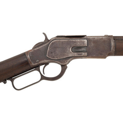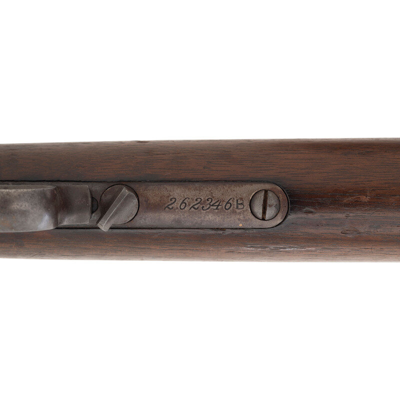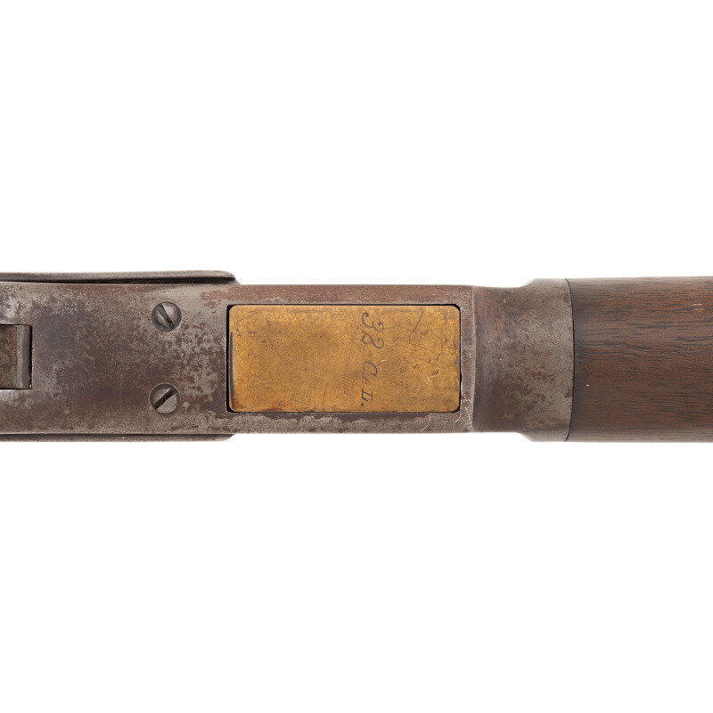 .32-20 WCF. 24" octagonal barrel with full magazine. SN: 262346B (mfg. ca.1888). Blued finish, color casehardened lever and hammer, brass cartridge lifter, smooth walnut forend and straight gripped stock with crescent buttplate. Lever action tubular magazine fed rifle with semi-buckhorn elevation adjustable rear sight and replaced dovetailed blade front sight. Standard Winchester markings on barrel, serial number on lower tang and caliber markings on both the brass cartridge lifter and the barrel.