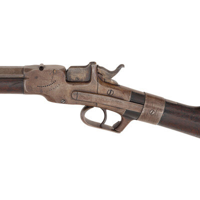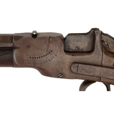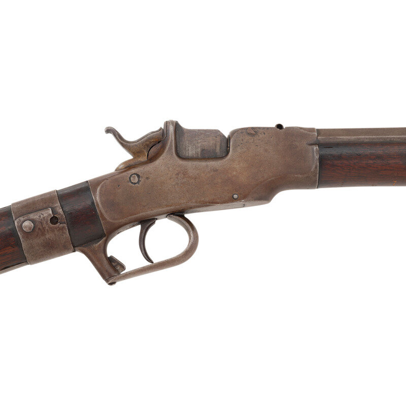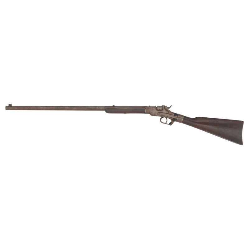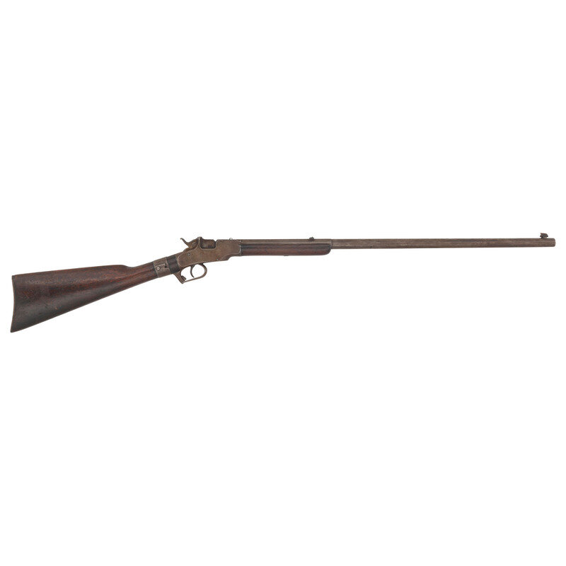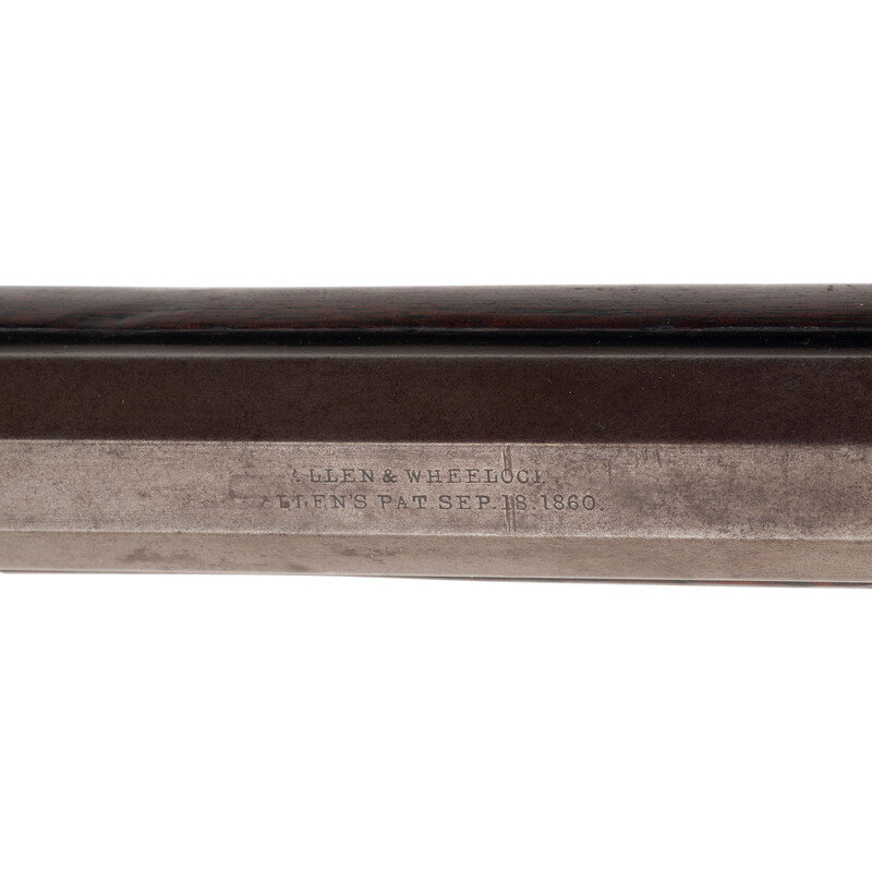 .38 RF. 26" octagon to round barrel. SN: 362. No finish remaining, smooth walnut forend and straight gripped smooth walnut stock with crescent buttplate. Single shot dropping breech metallic cartridge rifle. Two line barrel mark reads ALLEN & WHEELOCK/ALLEN'S PATENT SEPT. 18, 1860. Matching serial (assembly) numbers on barrel under forend, inside forend and on breech lever mechanism. Frame serial number not visible due to wrist repair. Designed for the Allen patent adjustable rear sight system, which is missing. An incorrect dovetailed rear sight base is also present in the barrel cut and an incorrect replacement blade front sight is present. Trap door in butt for tool is empty.