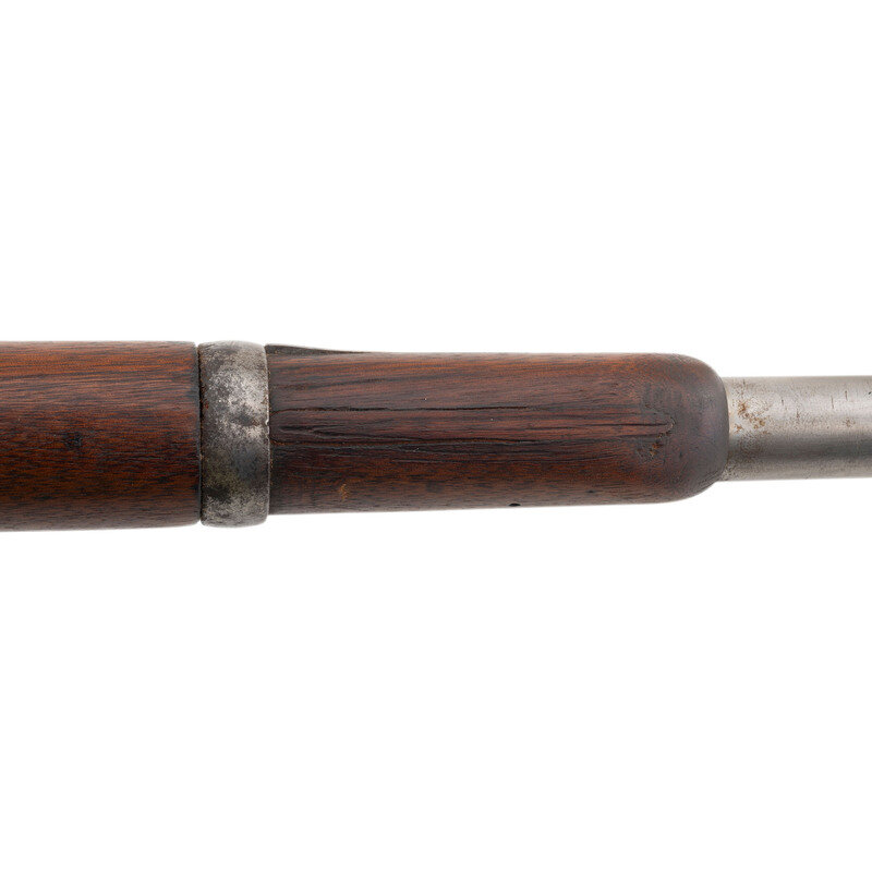 .45-70. 22" barrel. SN: 92379 (mfg. ca.1878). No finish remaining, walnut stock with long comb and short, thick wrist. Single shot breechloading metallic cartridge military rifle altered to carbine. Lock marked in two lines U.S./SPRINGFIELD and with a {Spread-Winged Eagle}, breech block marked U.S./MODEL/1873. Narrow receiver, low arch breech with bronze firing pin, three click tumbler, smooth trigger, "R" marked continuous curved base rear sight, front sight missing, saddle bar added to counterpane. Stock with solid buttplate and without carbine cleaning rod cut out, rifle cleaning rod channel in forend filled, upper band without stacking swivel. Top of comb rack marked 42.
