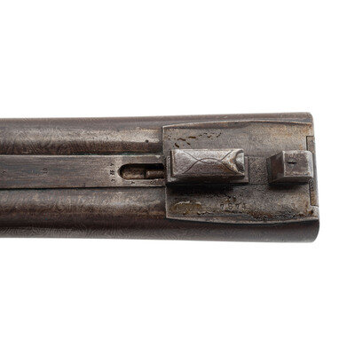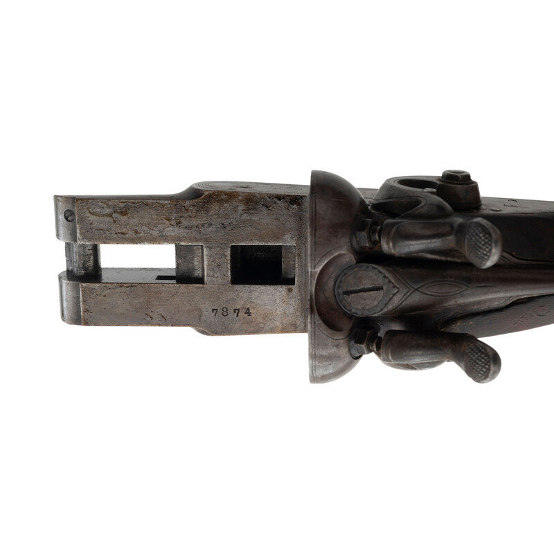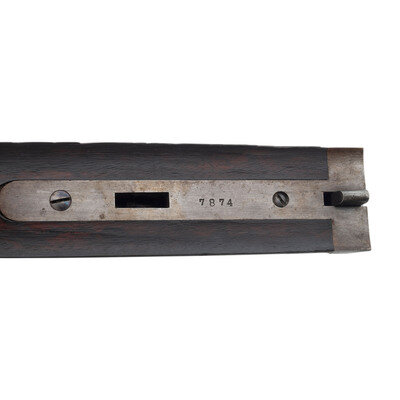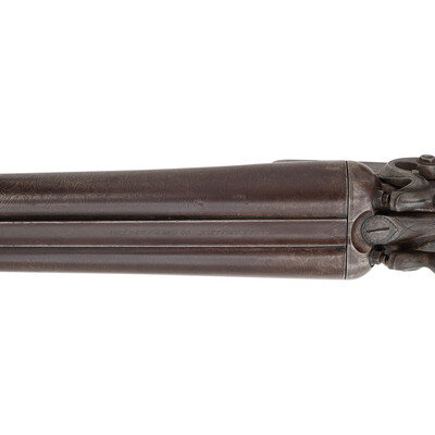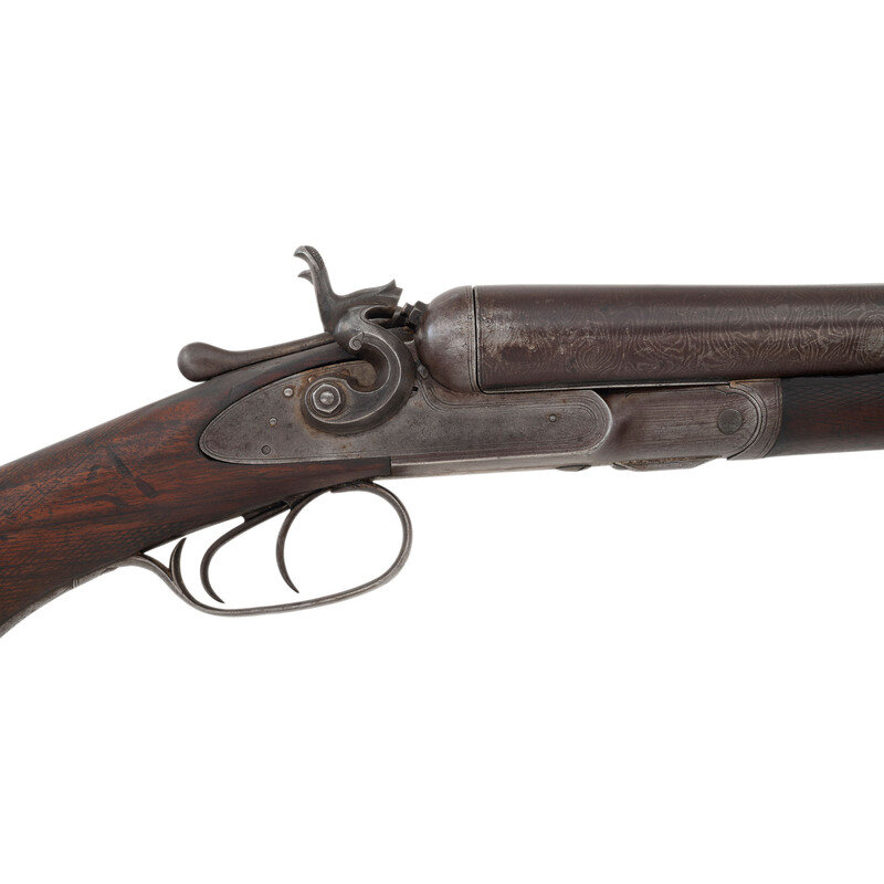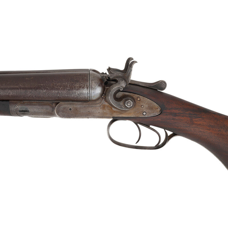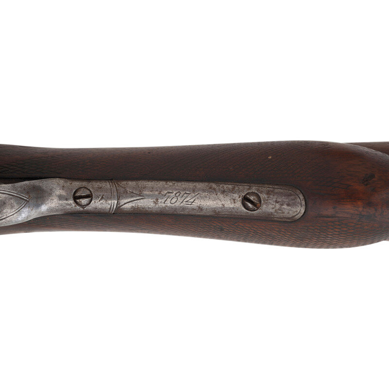 10 gauge. 26" barrels. SN: 7874 (mfg. ca.1881). Browned Damascus patterned barrels with 3" chambers and nominally cylinder bore, color casehardened locks and steel furniture, checkered walnut forend with contrasting tip insert and checkered pistol gripped buttstock with checkered hard rubber Rampant Colt buttplate. Side by side metallic cartridge breechloading shotgun with double triggers, exposed hammers and no front sight, suggesting that the barrels may have been shortened. Plain locks marked COLT'S PT F.A. MFG CO. Barrel rib marked COLT'S PT F.A. MFG CO. HARTFORD, CT U.S.A. Matching serial numbers on triggerguard, under barrels and inside forend. 13.5" length of pull, 2." drop at comb, 3.5" drop at heel.