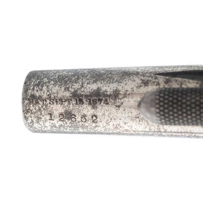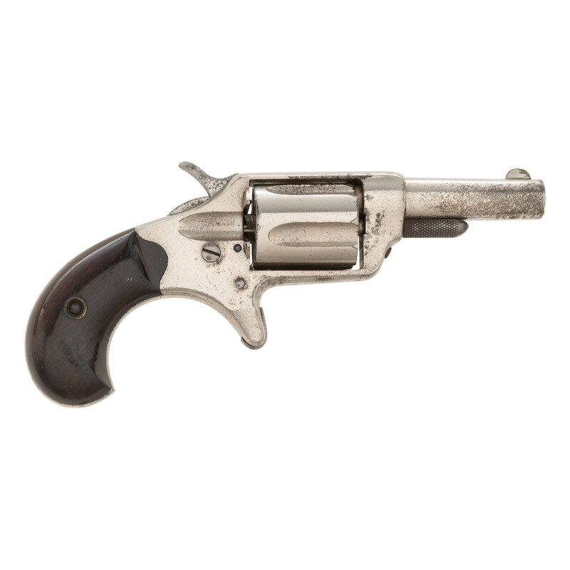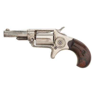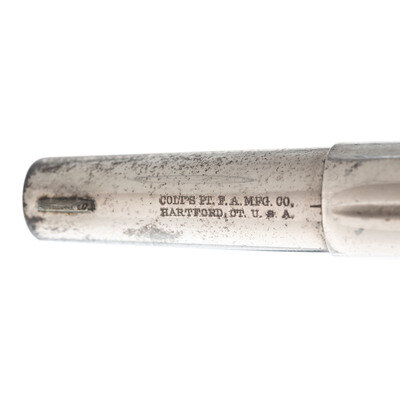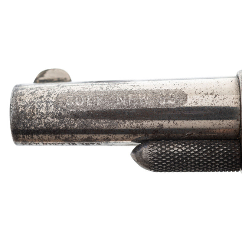 .32 Long colt. 2.25" barrel length. SN: 12652 (Mfg. ca.1876). Nickel metal finish with blued small parts, varnished rosewood grips, etched panel to left barrel, and patent mark to underside of barrel. Single action loading gate revolver with 5-shot cylinder. Item marked COLT NEW 32 to left barrel and PAT SEPT 15. 1874 beneath barrel. Top of barrel shows two line colt address marking. Serial numbers to frame, barrel, and cylinder all match. Left grip panel interior shows pencil mark matching serial number of revolver.
