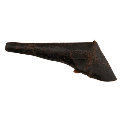 Unmarked military style flap holster that fits a Colt Model 1860 Army revolver with an 11.5" primary body length and a nominally 15" overall length with the flap closed. Flap with integral closure tab that engages a small brass finial. Sewn belt loop on reverse is nominally 1" wide and will only accommodate a belt roughly 1.5" in width, suggesting it was not intended for use with a typical military issue belt of the period, which is typically somewhat wider. Sewn only construction without rivet reinforcements and made of relatively thin split bridle leather with a surface finish that is a dark chocolate brown rather than black. A sewn in toe plug is in place of the bottom of the holster. A nice looking, mid-19th century military style "civilian" holster for a Colt Army that would look quite appropriate in a display of southern cavalry items.