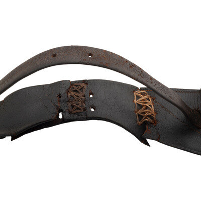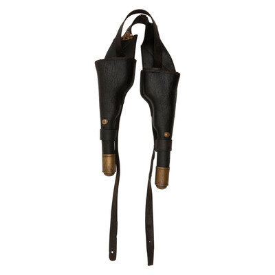 12.5" long form fitting holster bodies with 2.25" brass caps at the end. Likely intended for use with either a Colt Model 1851 Navy or Model 1860 Army, although the use of pommel holsters had declined substantially by the time the Model 1860 Army entered service. An 1860 Army will fit in the holsters. Both holsters are missing their covering flaps, but the brass closure ball finials remain in place. The leather that attaches the two holsters is damaged and repaired with haphazard stitching. The two tack attachment straps remain intact, measuring 21" in length from the inner slot through which they pass and extending about 8.25" below the bottom of the holster bodies. No maker or retailer marks are visible. A well worn set of holsters for Colt revolvers that would be a nice addition to a pre-Civil War western cavalry display.