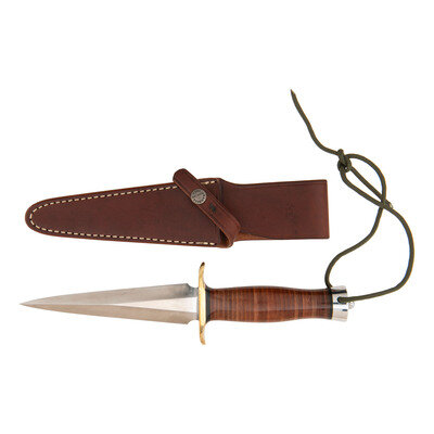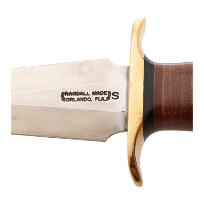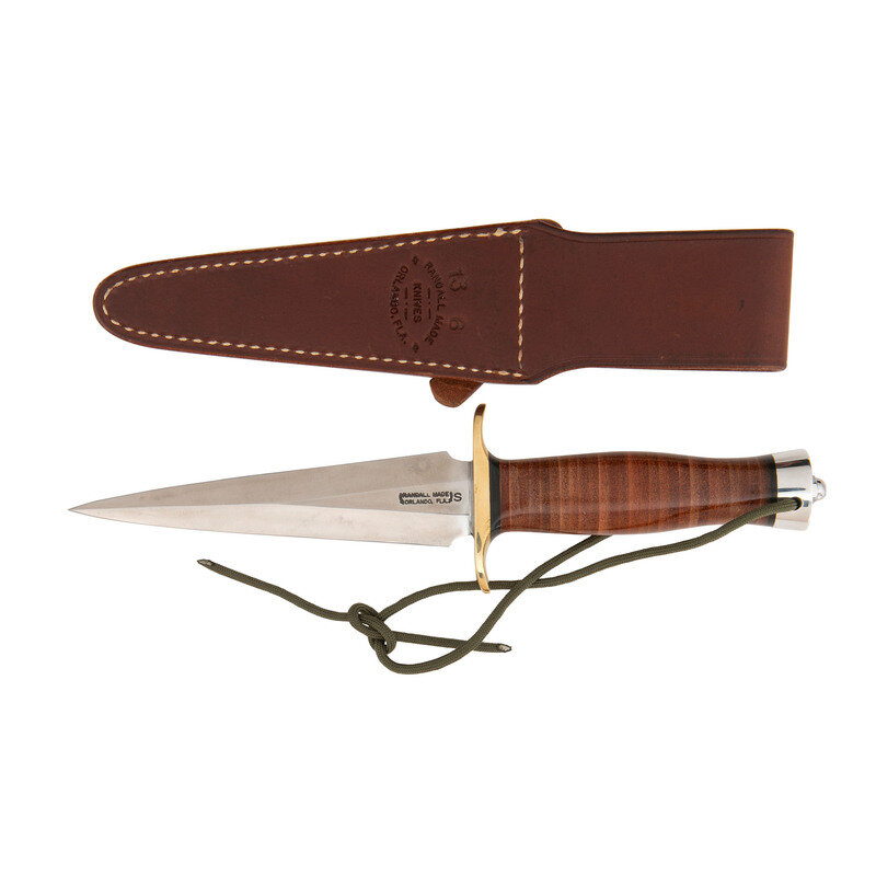 6" double edged triangular dagger blade, 11" in overall length. Stacked leather washer grip with palm swell and 2.75" brass guard with steel pommel cap with lanyard hole, OD green para cord lanyard and capstan nut. Left side of blade stamped in two lines: RANDALL MADE/ORLANDO, FLA. Includes leather scabbard with a leather snap strap hilt retainer. Rear of scabbard marked 13 6/RANDALL MADE/KNIVES/ORLAND, FLA.
