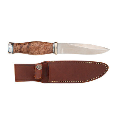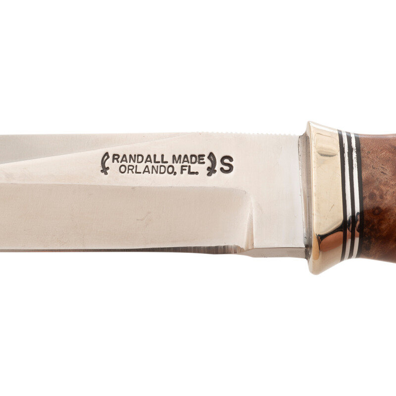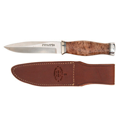 5" drop point single edged blade, 9.5" in overall length. Figured hardwood grip with prominent palm swell, no cross guard with steel pommel cap. Left side of blade stamped in two lines: RANDALL MADE/ORLANDO, FLA. Includes leather scabbard with a leather snap strap hilt retainer. Rear of scabbard marked 5/RANDALL MADE/KNIVES/ORLAND, FLA.