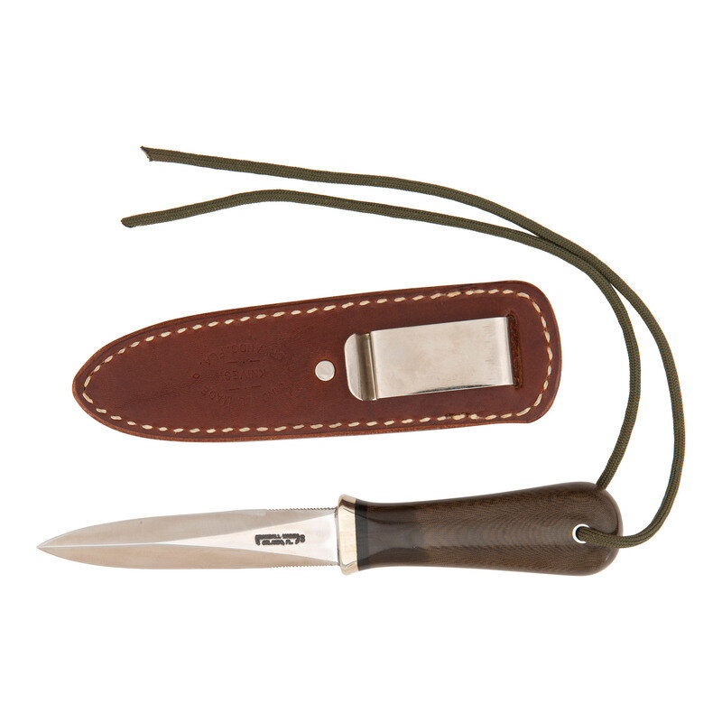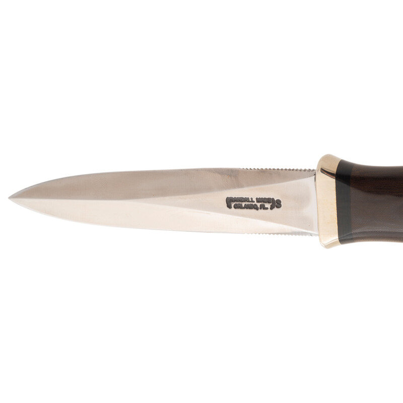 4" double edged dagger point blade with 1" serrations on the spines at the hilt. 8" in overall length. Composite bag shaped grip without guard no pommel cap, lanyard hole in grip with OD green para cord lanyard. Left side of blade stamped in two lines: RANDALL MADE/ORLANDO, FLA. Includes leather scabbard with steel belt clip. Rear of scabbard marked RANDALL MADE/KNIVES/ORLAND, FLA.