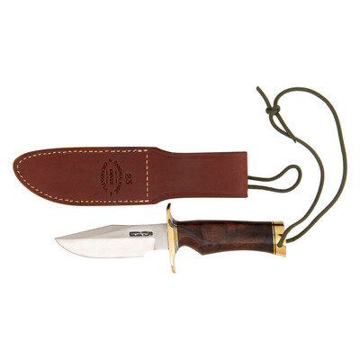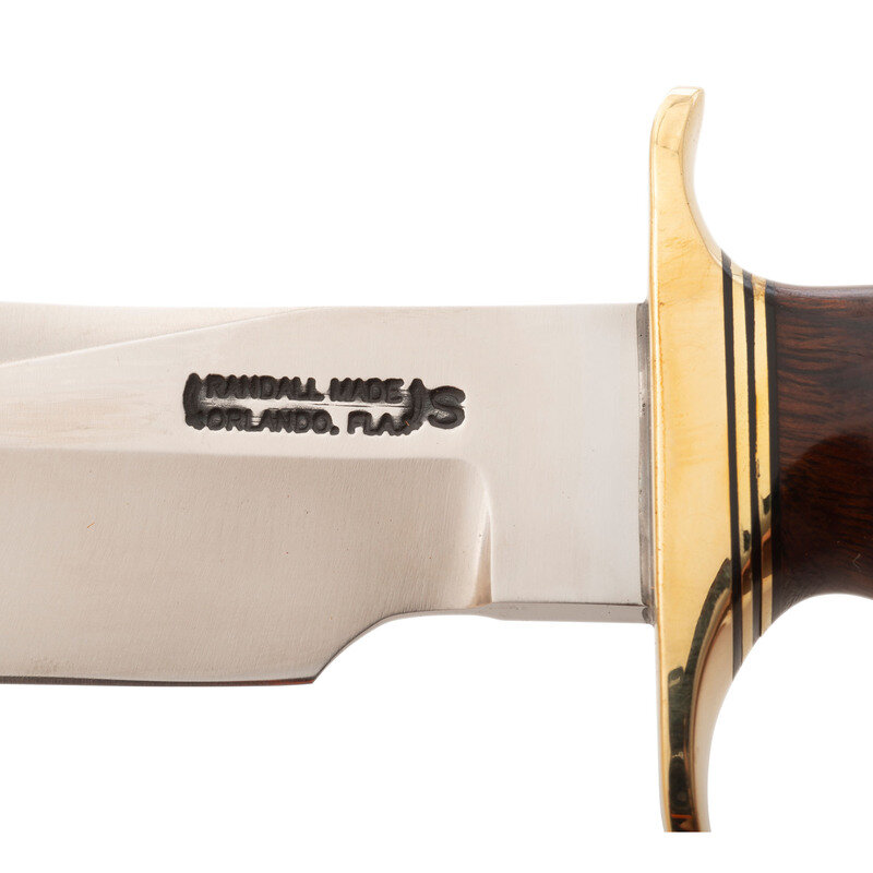 4.5" single edged drop point blade with 1" choil, 9" in overall length. Figured hardwood grip with single finger groove and 2.75" brass guard with brass pommel cap with lanyard hole and OD green para cord lanyard. Left side of blade stamped in two lines: RANDALL MADE/ORLANDO, FLA. Includes leather scabbard with sharpening stone on face and both a leather snap strap and para cord hilt retainer. Rear of scabbard marked 23/RANDALL MADE/KNIVES/ORLAND, FLA.