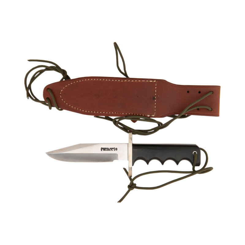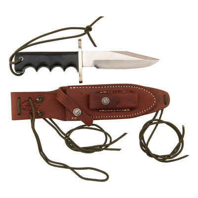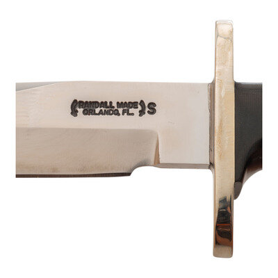 5.375" single edged drop point blade with 1" choil, 9.875" in overall length. Finger grooved composite grip with and 3" steel guard with no pommel cap, lanyard hole in grip with OD green para cord lanyard. Left side of blade stamped in two lines: RANDALL MADE/ORLANDO, FLA. Includes leather scabbard with sharpening stone on face and both a leather snap strap and para cord hilt retainer. Face of scabbard's belt loop is marked RANDALL MADE/KNIVES/ORLAND, FLA.
