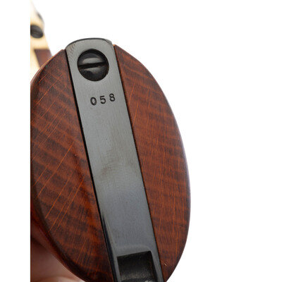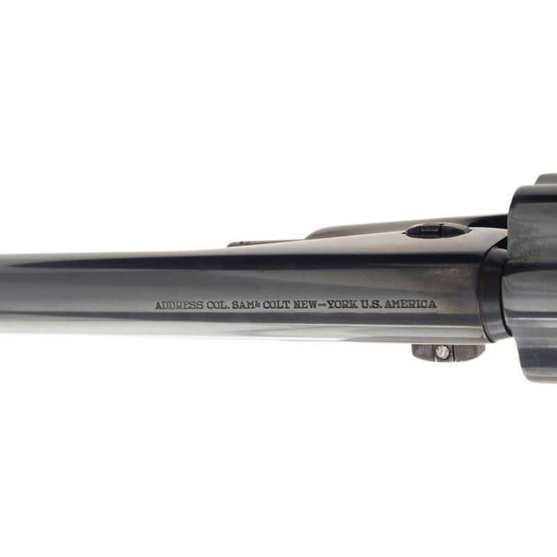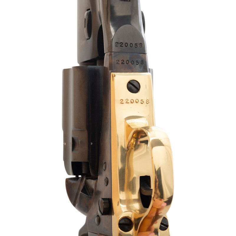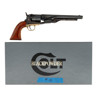 .44 caliber. 8" round barrel. SN: 220058. Blued and color casehardened finish, brass triggerguard, varnished hardwood grip. Replica of the Colt 1860 single action percussion revolver with a six-chambered fluted cylinder, four-screw frame, creeping loading lever, hammer nose notch rear sight and blade front sight. Revolver features Samuel Colt's signature on the backstrap. Includes the factory gray cardboard box with fitted gray interior.
