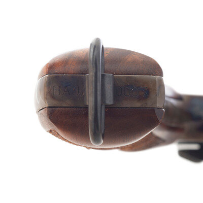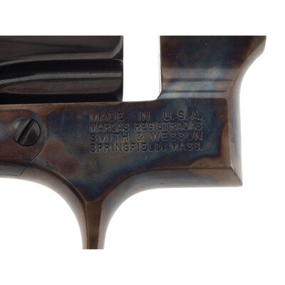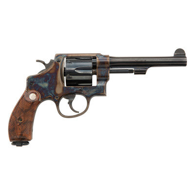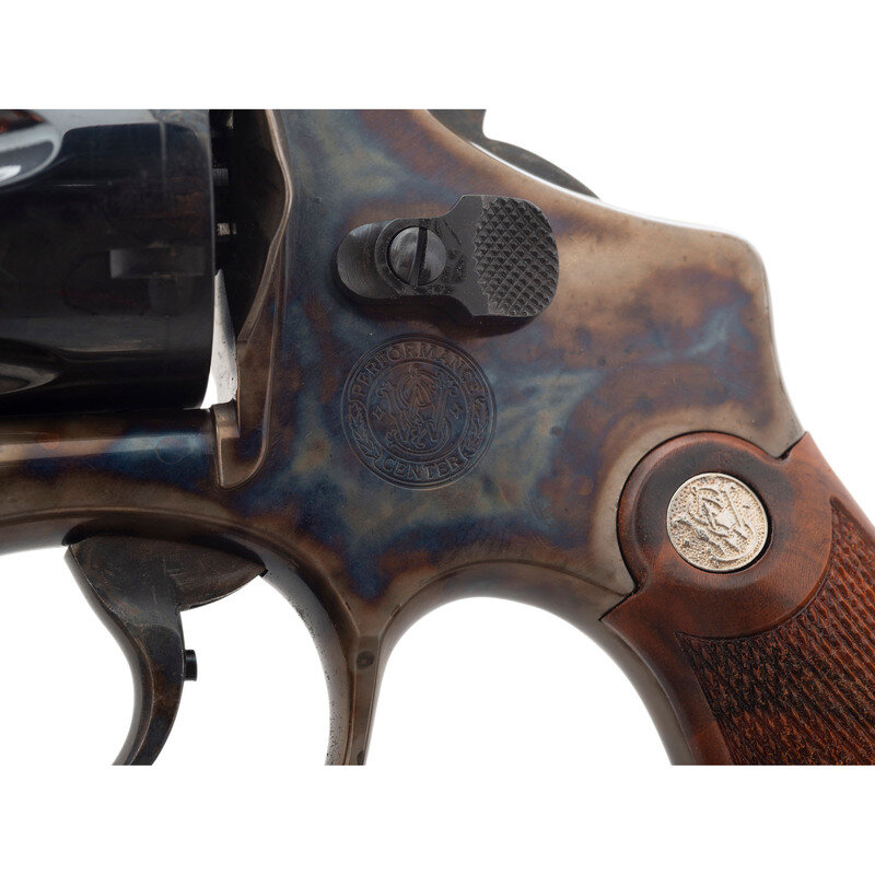 .45 ACP. 5.5" barrel length. SN: BAJ0007. Blued metal finish with case colored frame and casehardened hammer and trigger mounting checkered walnut Smith & Wesson medallion grips. Double action six-shot hand ejector revolver mounting topstrap notch and pinned front blade sights. Item features a lanyard loop to the butt, and Smith & Wesson's Performance Center logo on the left frame. Further markings include the standard model marking and four-line address to the right frame. Item comes in a matching gold colored box containing three full moon clips, and the owner's manual with inserts.