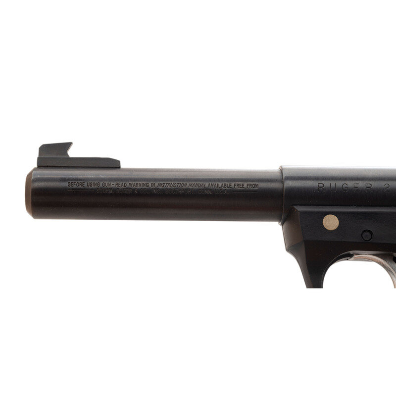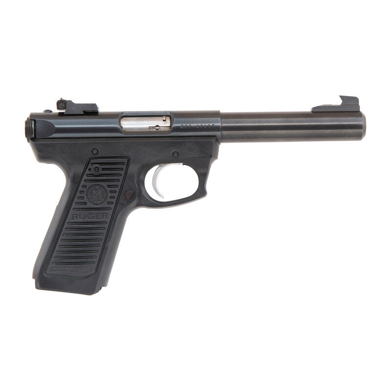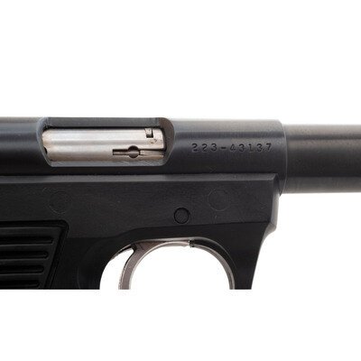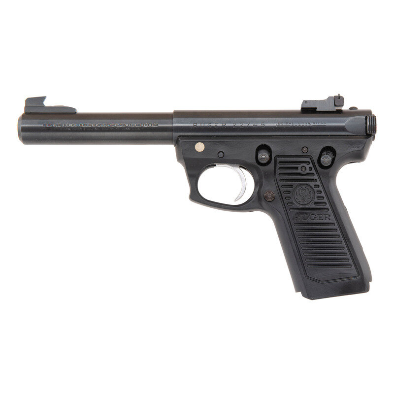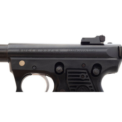 .22 LR. 5.5" barrel length. SN: 223-43137. Blued metal finish with polished bolt and mounting a black synthetic frame with RUGER grip panels. Simple blowback operated striker action autoloading pistol fed by detachable single stack magazines. Item mounts adjustable target rear notch and forward Patridge sights along a heavy barrel that is internally threaded for accessory mounting. Markings include the two-line warning and address on the barrel, and the RUGER 22/45 model marking on the left upper receiver. Item comes with no magazine.