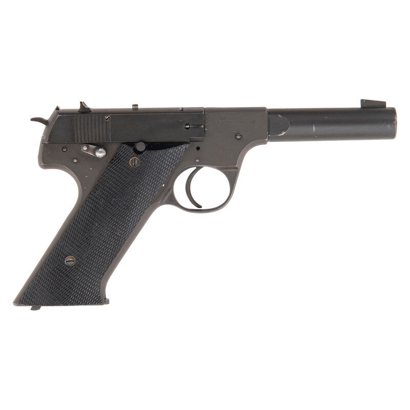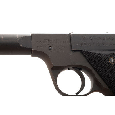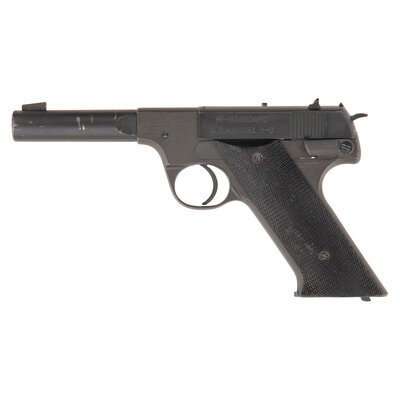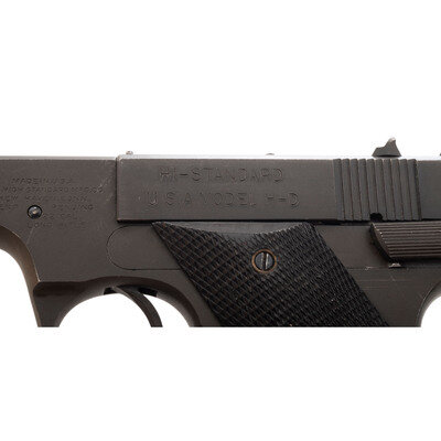 .22 LR. 4.5" barrel length. SN: 130929. Parkerized metal finish overall with black checkered synthetic grips. Single action simple blowback operated autoloading pistol fed by detachable single stack magazines. The right frame is struck PROPERTY OF/U.S. with a faint Ordnance {Crossed Cannons}. Left side shows the standard make and model markings including MADE IN U.S.A./THE HIGH STANDARD MFG. CO./NEW HAVEN. CONN./PATENT PENDING/.22 CAL./LONG RIFLE. Left slide marked HI-STANDARD/U.S.A. MODEL H-D. Top of the barrel is marked PROPERTY OF U.S.A. Item features drift adjustable rear notch and matted front blade sights. Comes with one blued magazine.