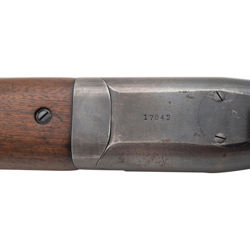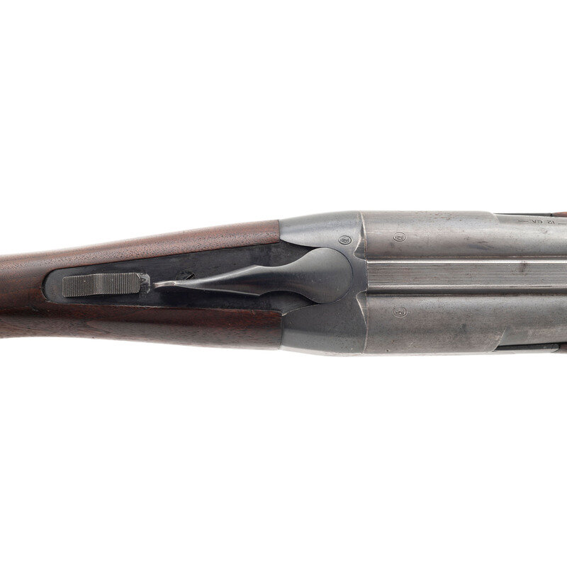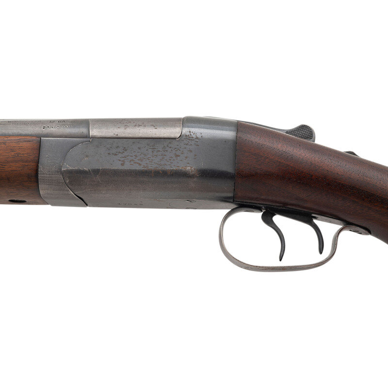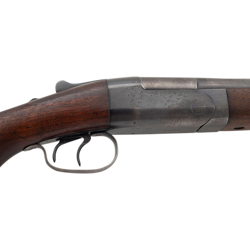 12 gauge. 30" barrels. Full and modified chokes. SN: 17842. Blued metal finish. Two piece walnut stock has a plain semi pistol grip and beavertail forearm. Break action side by side boxlock shotgun with a solid matte rib and steel bead front sight. Item features double triggers, extractors, and a checkered hard rubber buttplate.