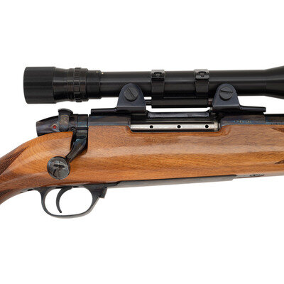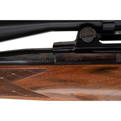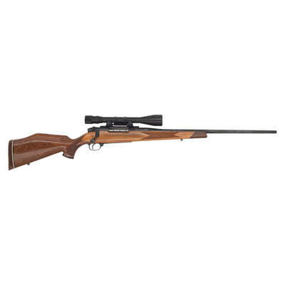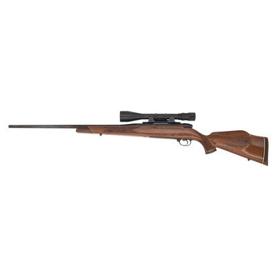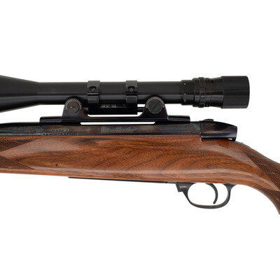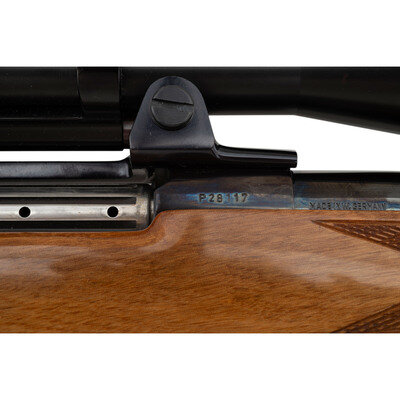 .300 WBY Mag. 24" barrel length. SN: P28117. Blued metal finish. Walnut Monte Carlo stock has skip-line checkering to semi pistol grip and forearm, with ivory spacers and rosewood caps to grip and forearm. Bolt action rifle with a Bausch & Lomb Balvar 8A 2.5-8x40mm scope. Item features an internal box magazine, vented rubber recoil pad, and double sling studs.