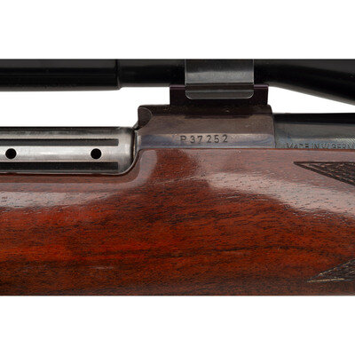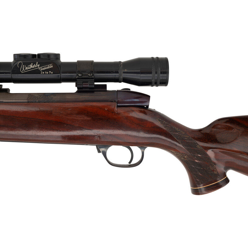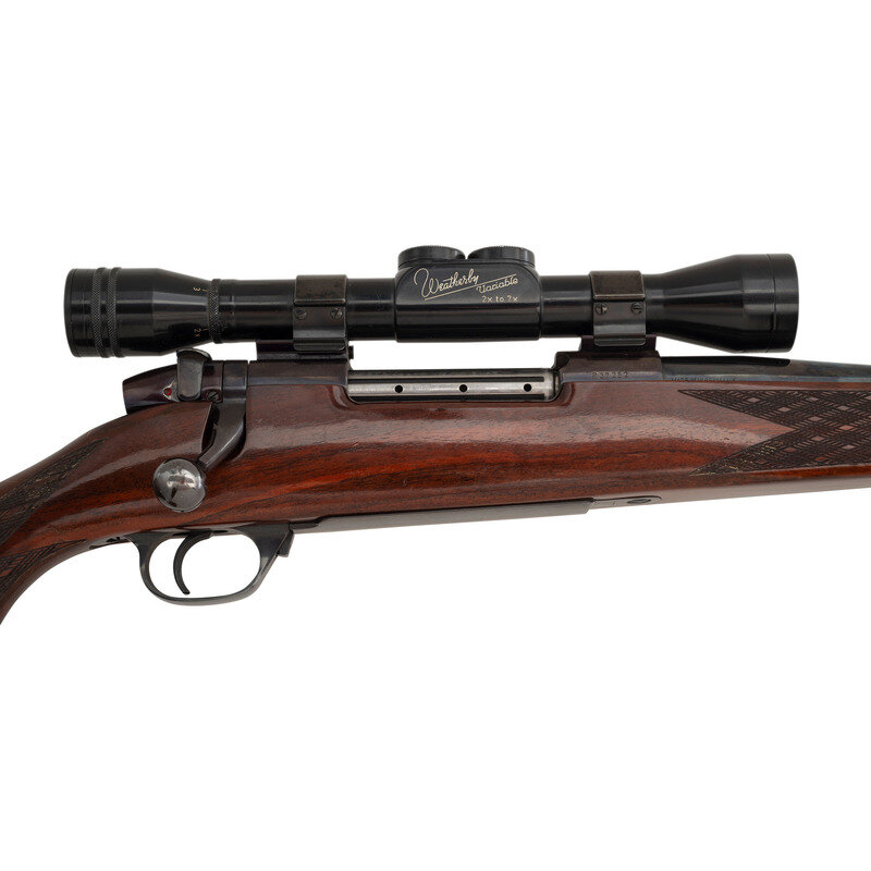 .300 Weatherby Magnum. 24" barrel length. SN: P37252. Blued metal finish. Attractively figured dark walnut Monte Carlo stock has skip-line checkering to semi pistol grip and forearm, with rosewood caps to grip and forend, ivory spacers, and ivory diamond inlay to grip cap. Bolt action rifle with a folding adjustable notch rear sight, ramp blade front sight, and Weatherby Variable 2-7x36mm scope on flip-to-side mounts that allow the user to easily switch from scope to iron sights. Item features an internal box magazine, double sling studs, vented recoil pad, and a ported barrel. Barrel and scope are marked as being made in West Germany, while receiver has Southgate, California manufacturer marks possibly meaning that the barrel was replaced at some point.