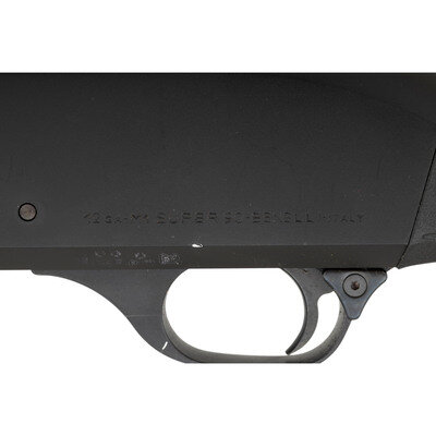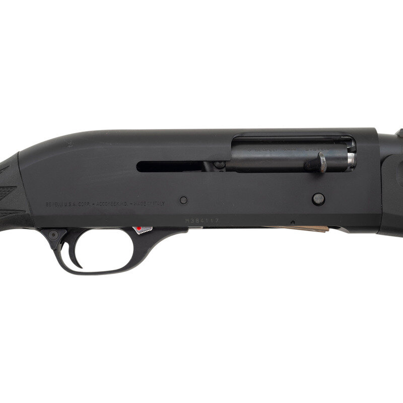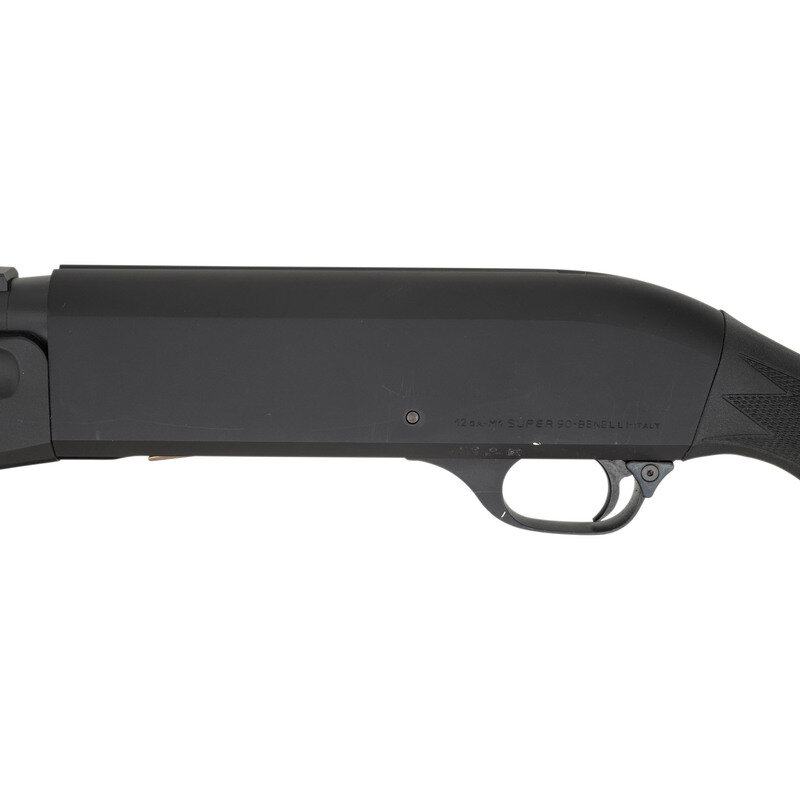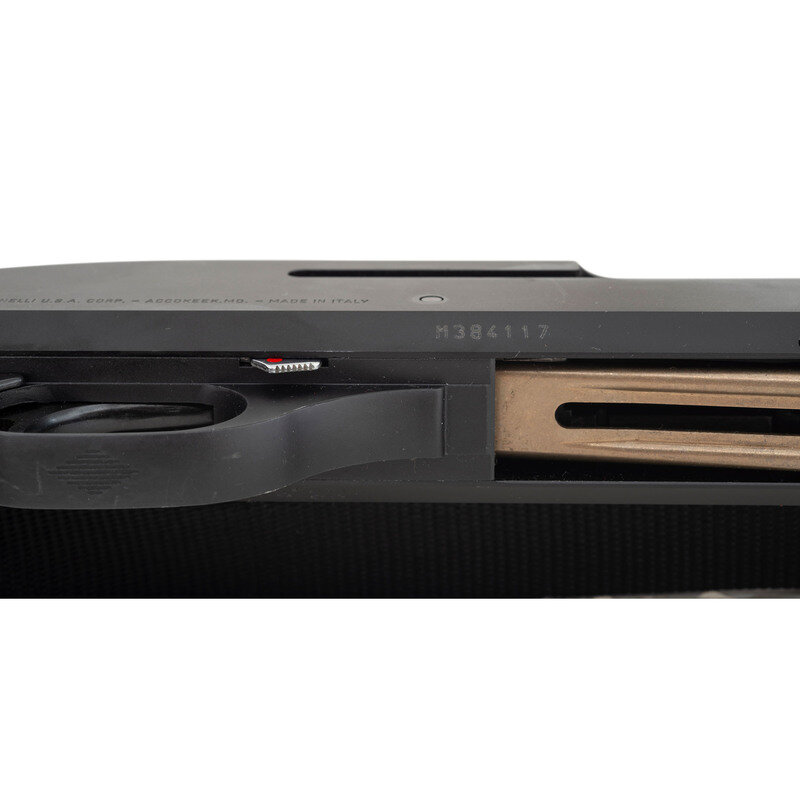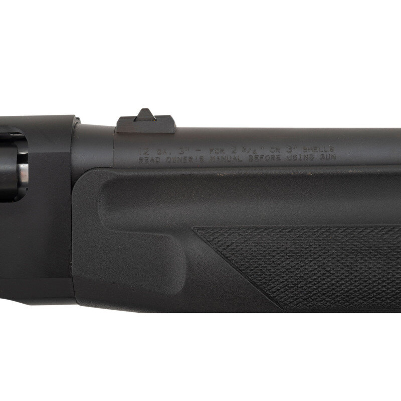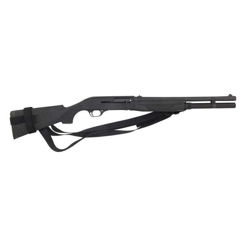 12 gauge. 18.5" barrel length. Threaded modified choke insert. SN: M384117. Parkerized metal finish. Black synthetic stock has checkering to semi pistol grip and beavertail forearm. Slide action shotgun with adjustable notch rear sight, blade front sight, tube magazine, and rubber recoil pad. Includes a black nylon sling.