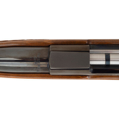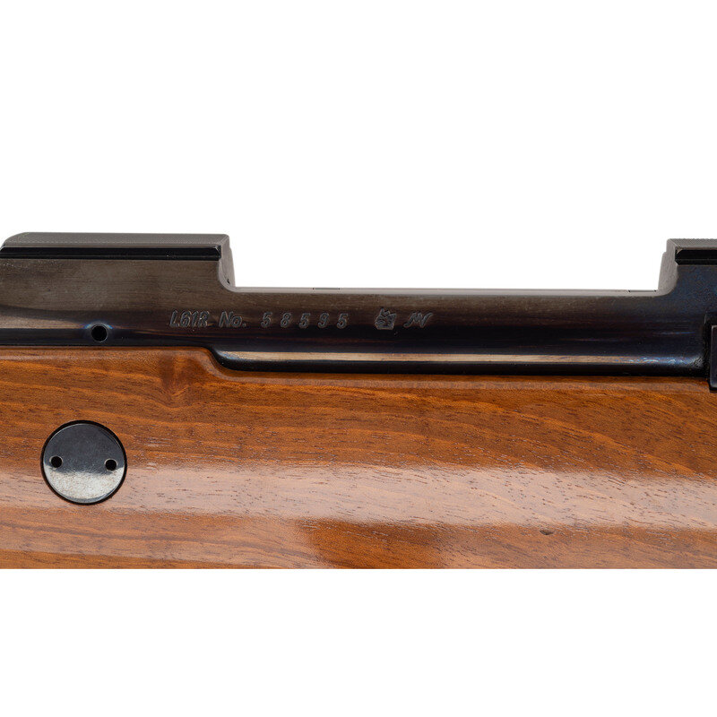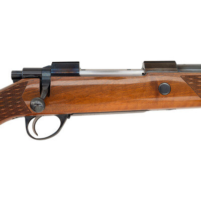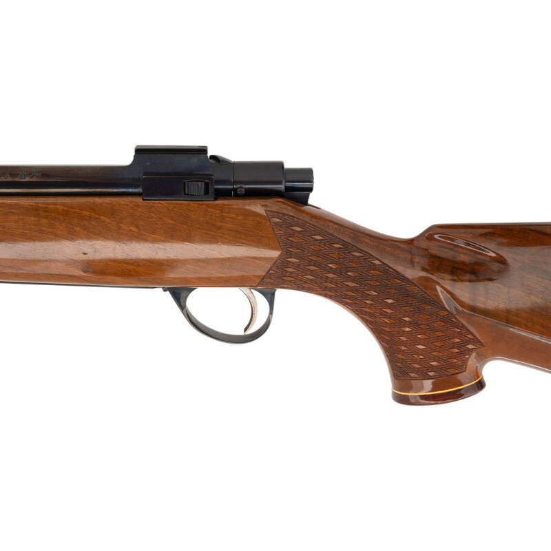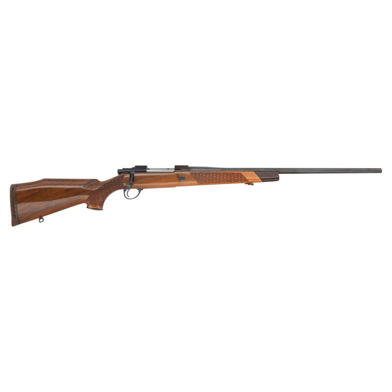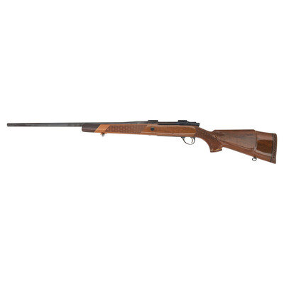 .338 Winchester Magnum. 24" barrel length. SN: 58595. Blued metal finish. Attractively figured walnut stock has skip-line checkering to semi pistol grip and forearm, with rosewood caps to grip and forend, ivory spacers, and a blonde wood bears head inlay to grip cap. Bolt action rifle with a receiver that has a checkered top strap and cuts for scope mounts. Item features an internal box magazine, double sling swivels, and a vented rubber recoil pad. Barrel has THE GARCIA CORP importer marks to bottom.